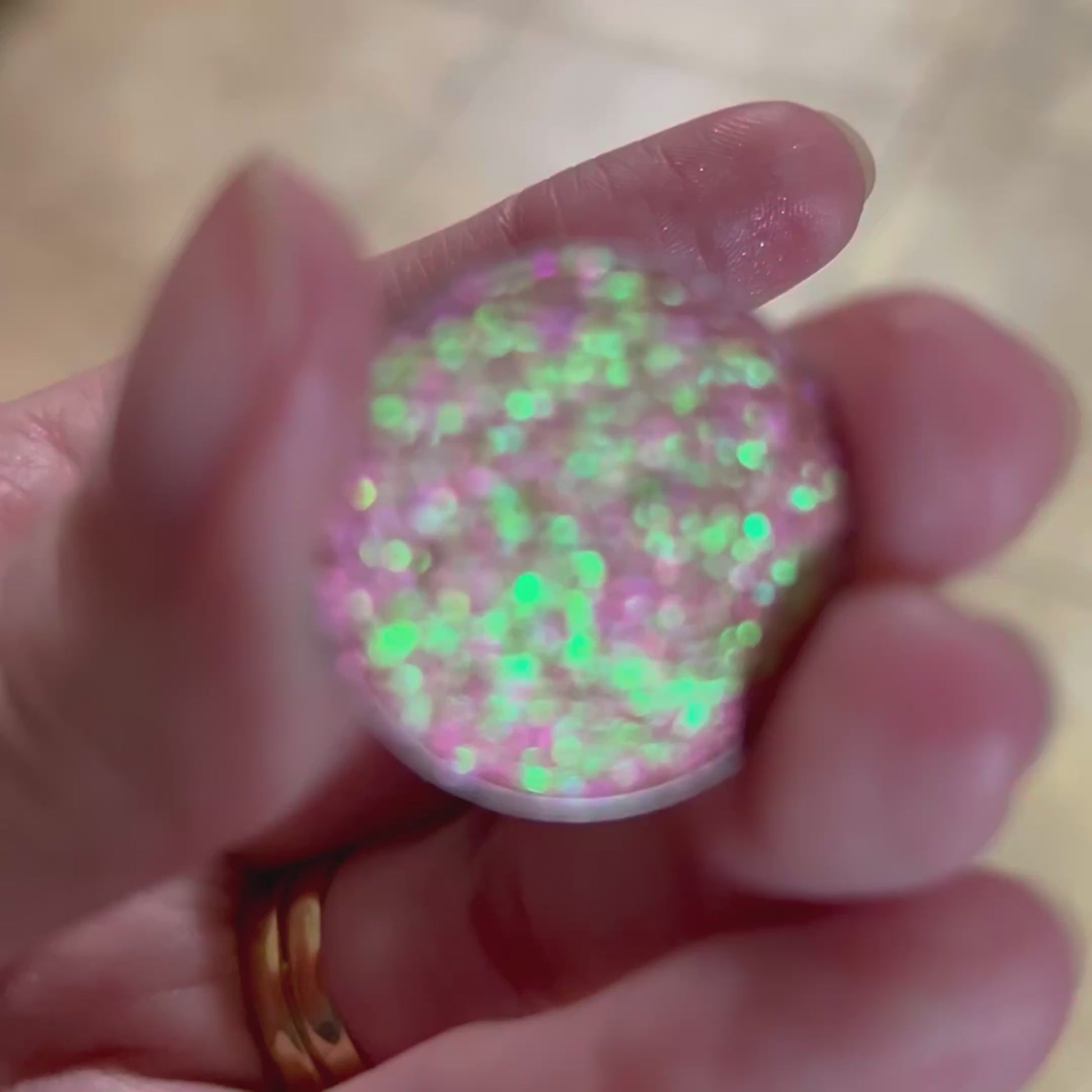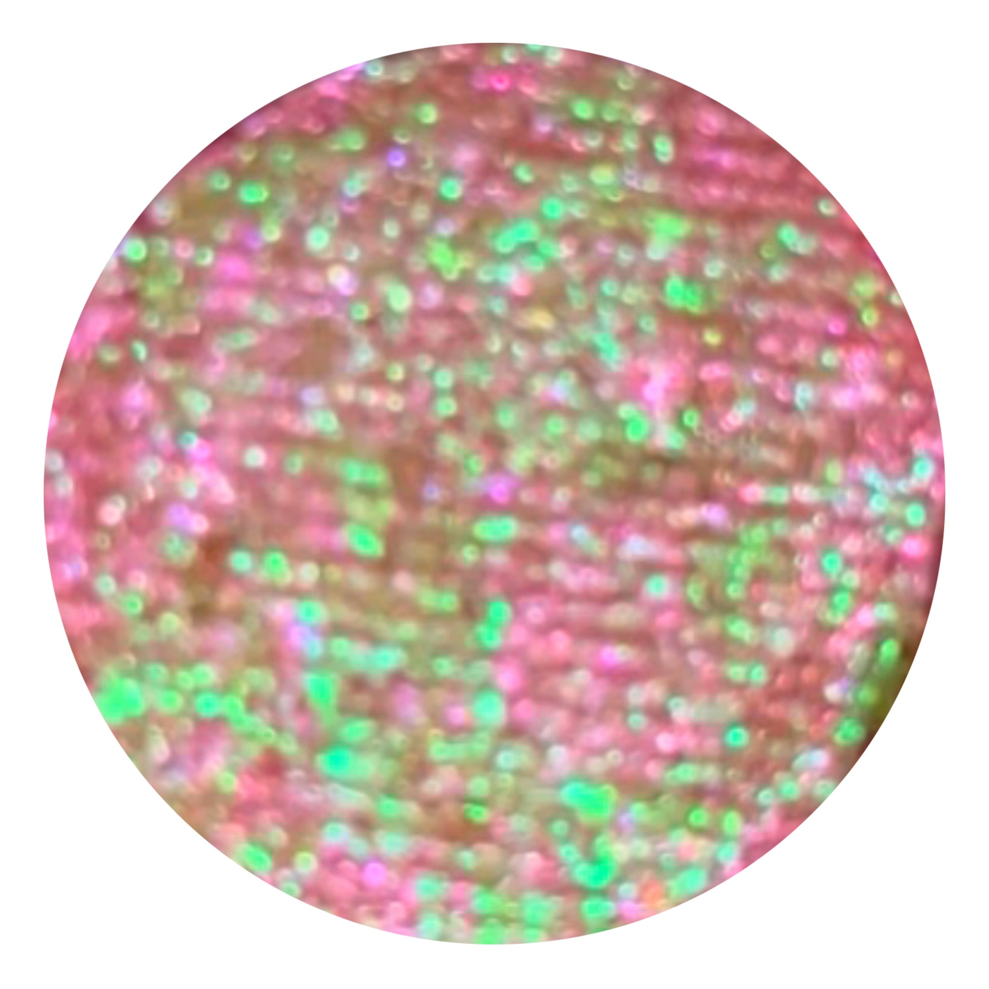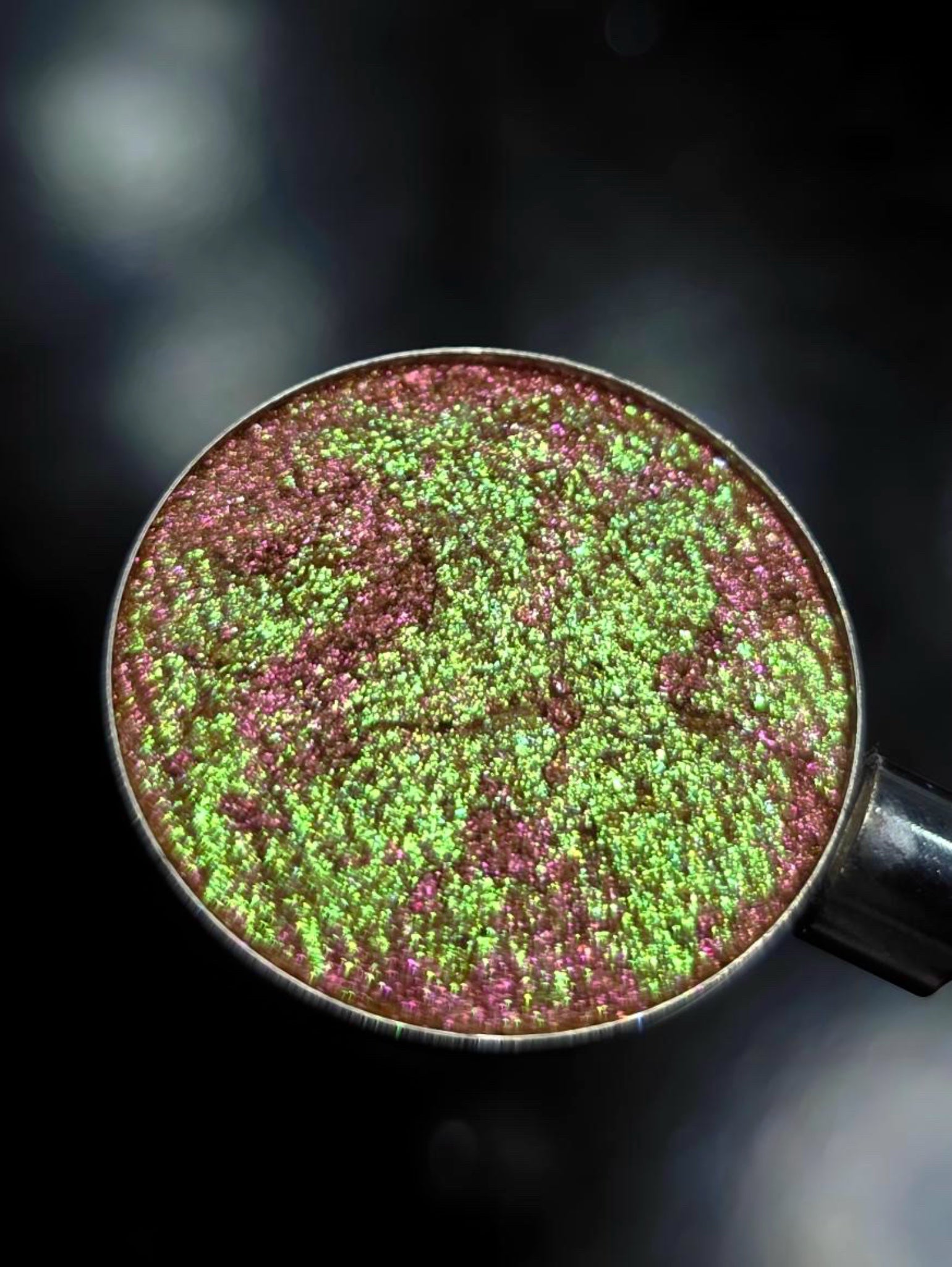 • OH MY GOURD - is a light yellow gold to iridescent green duochrome eyeshadow with yellow to teal to purple multi shifting sparkles.