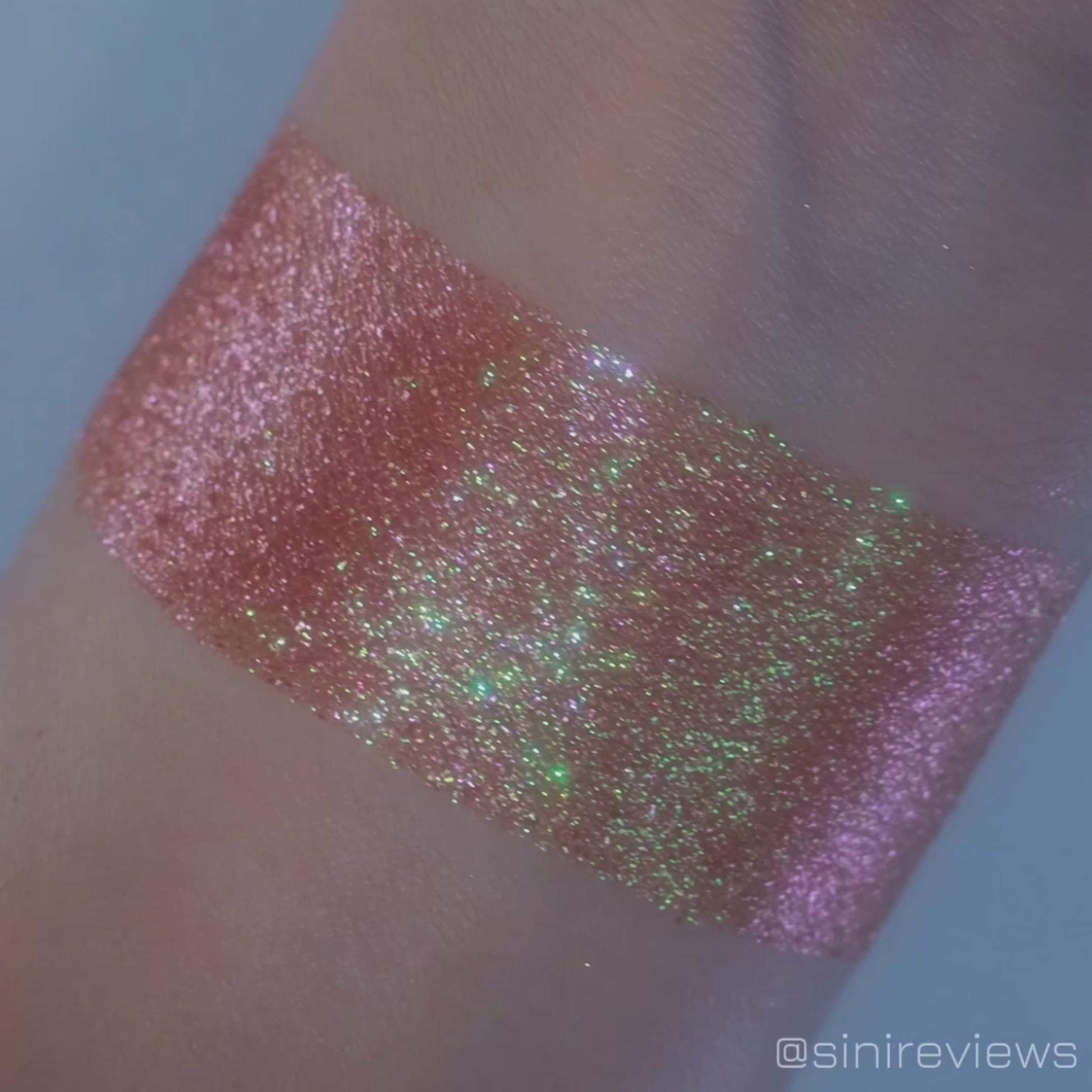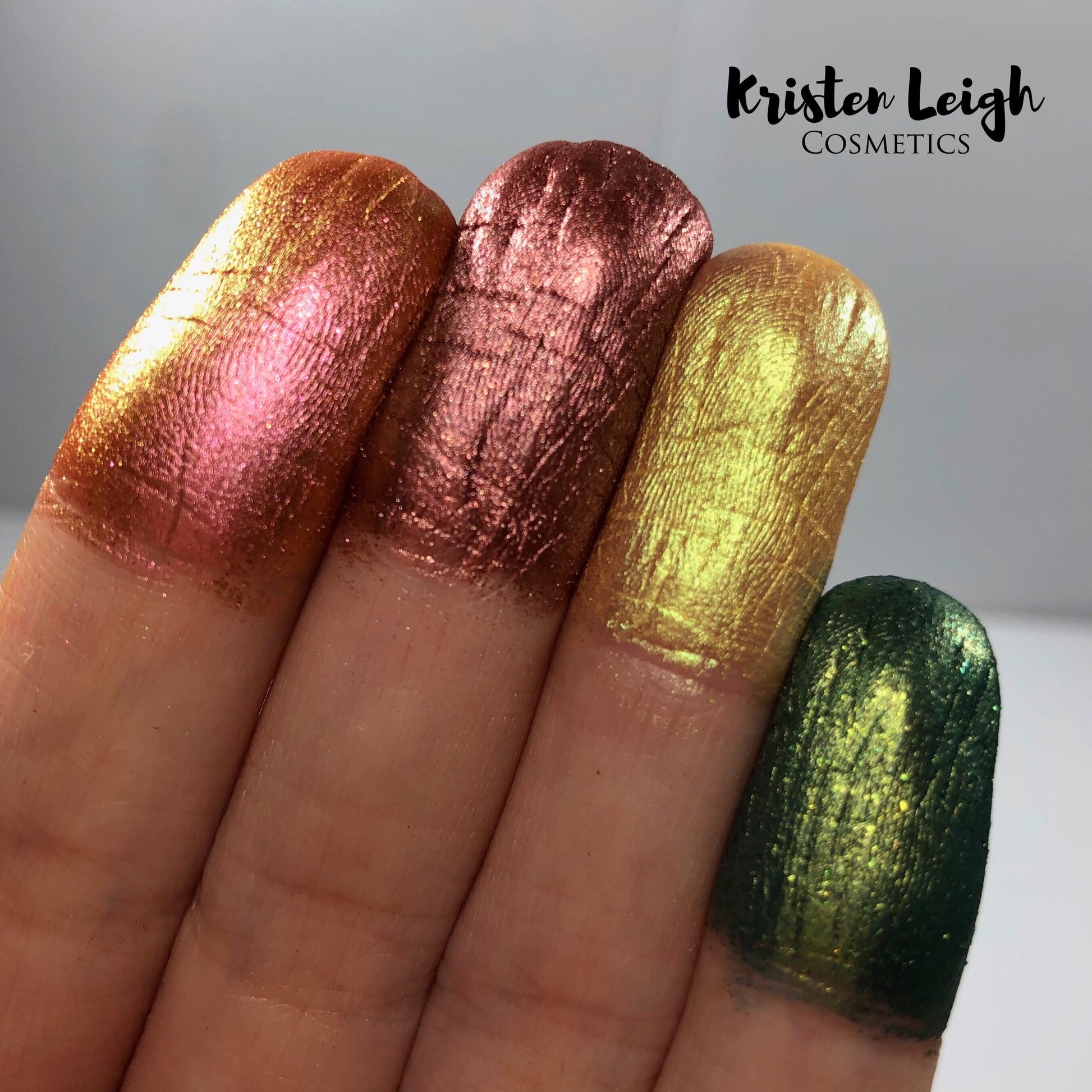 • FALLING LEAVES - is a sparkly deep pinkish red to bronze to orange to yellow gold and slight green multichrome eyeshadow with green to pinks shifting sparkles throughout