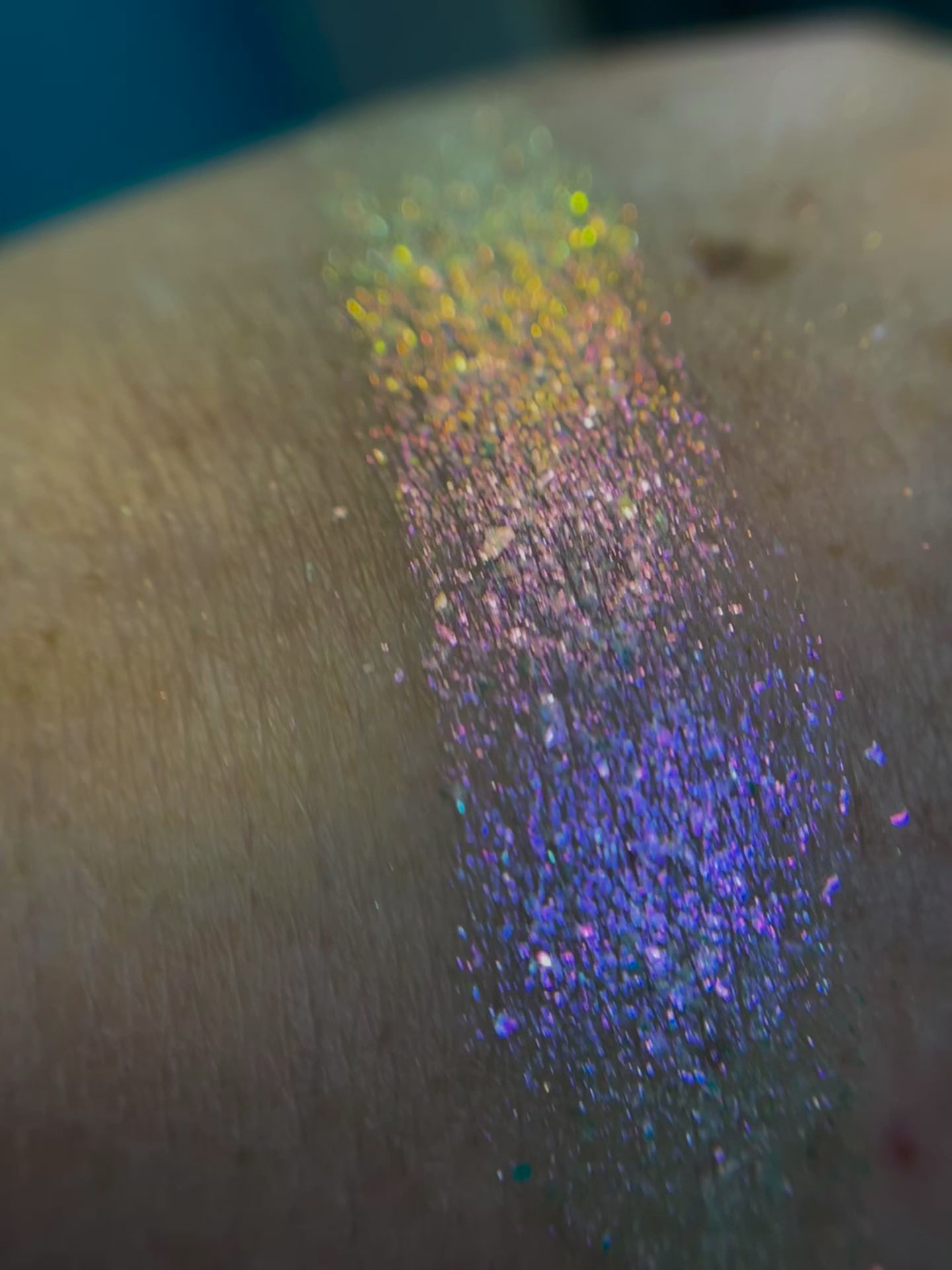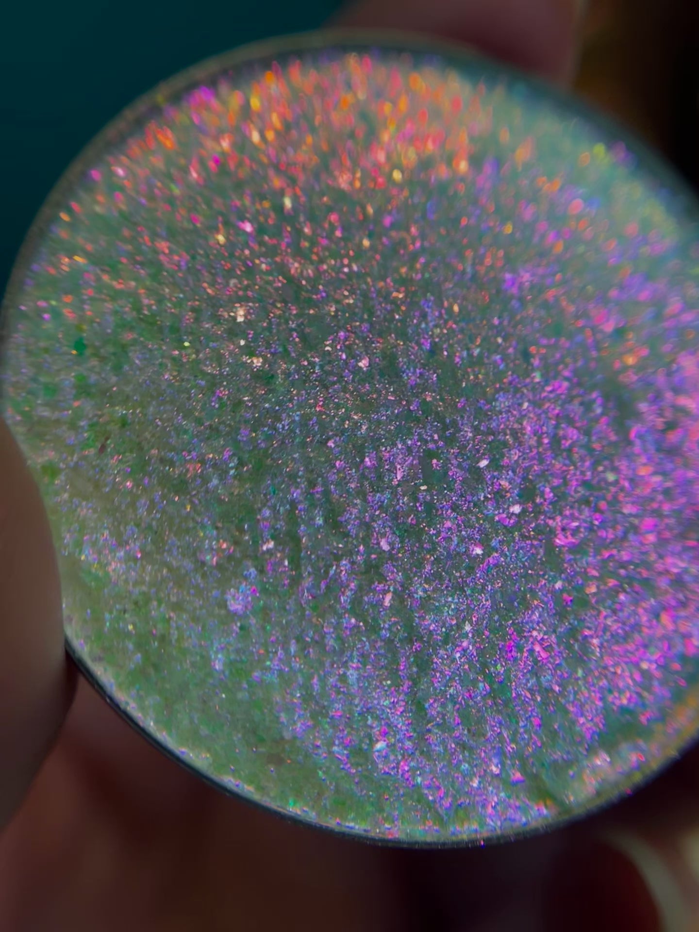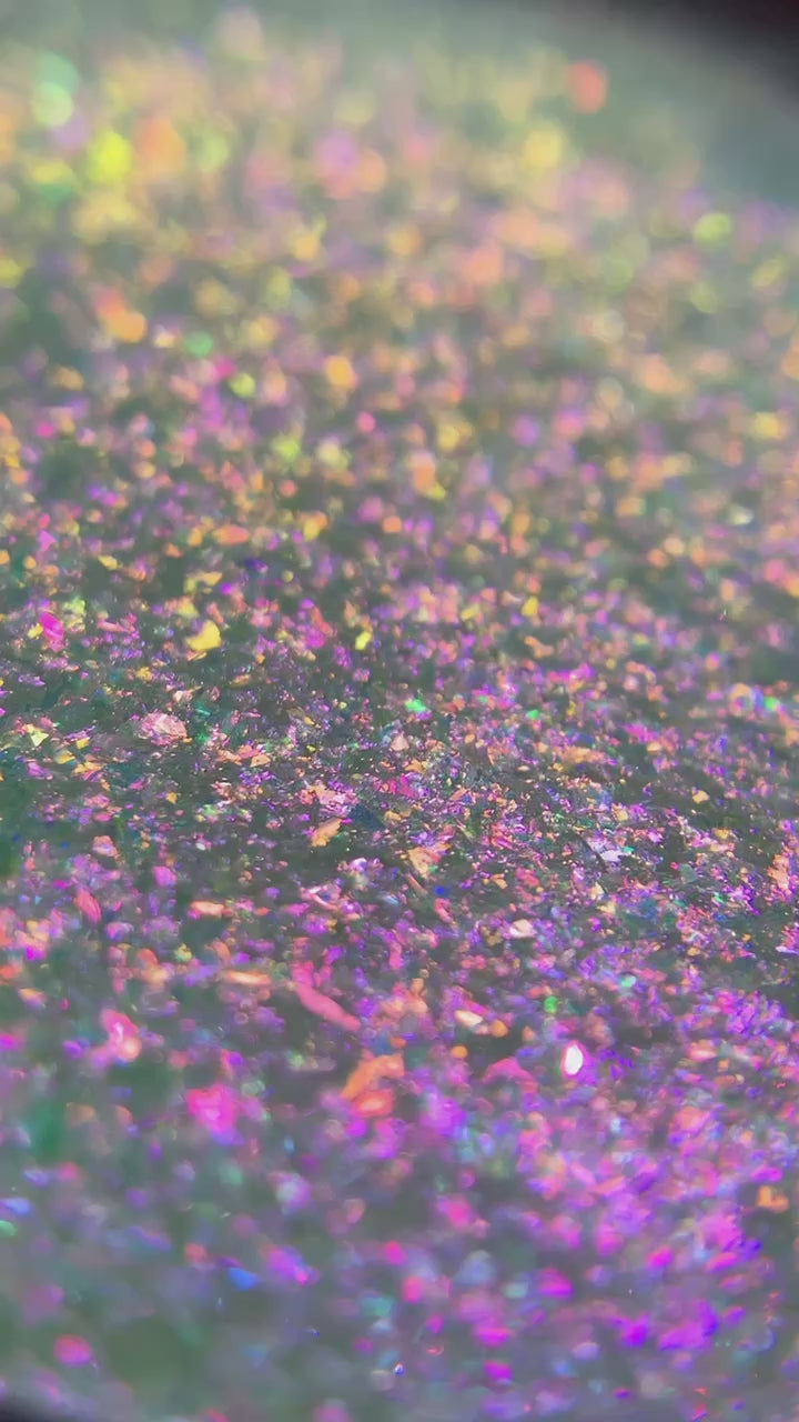 Has a soft flaky texture that smooths out beautifully. Depending on the different lighting and angles it shifts from 👉🏻 Iridescent Indigo to Purple to Pink to Orange to Yellow/ Gold to Green, with tons of multidimensional sparkles throughout, and a unique flakie topper.