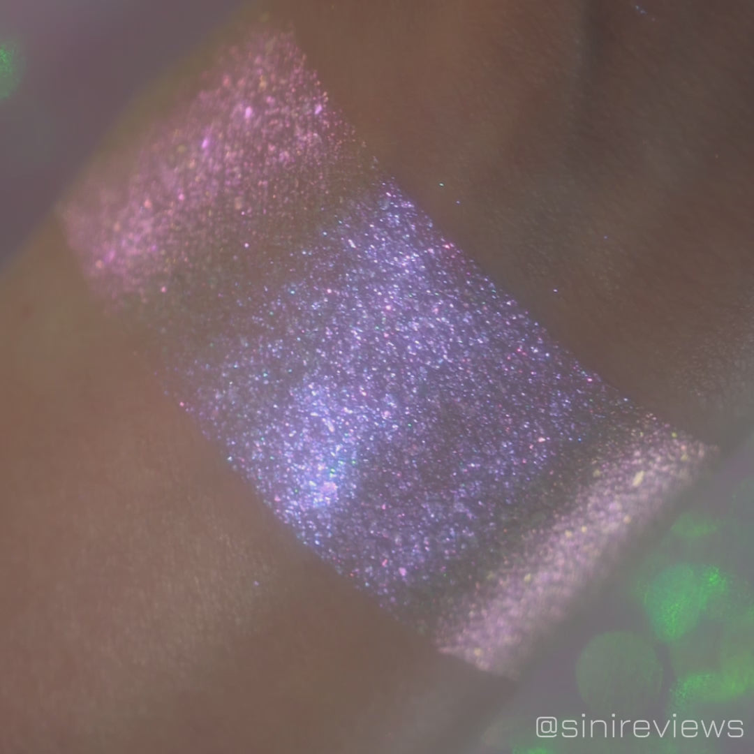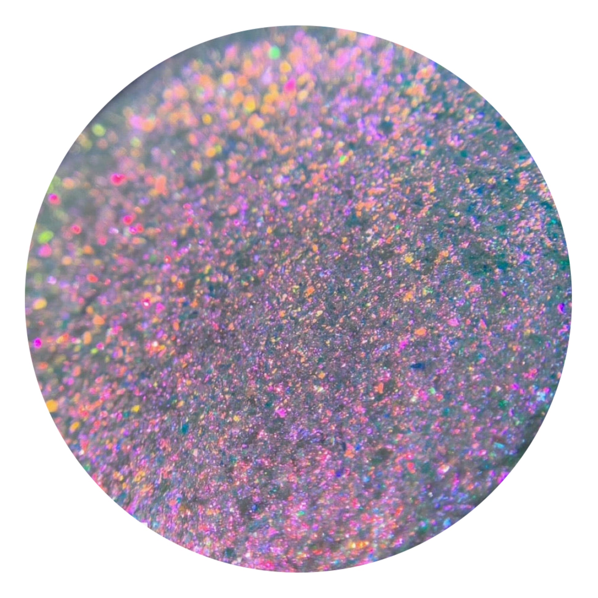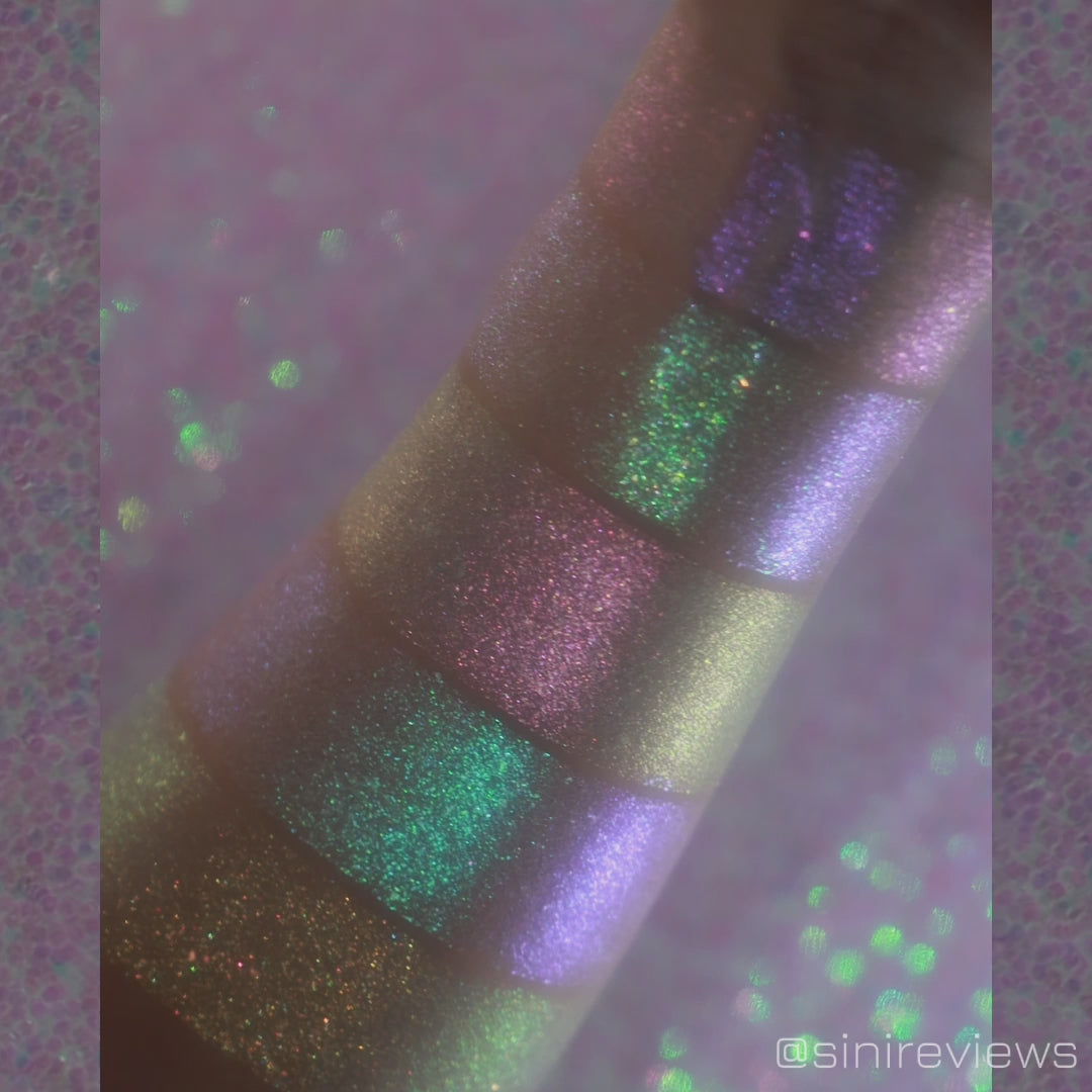 Has a soft flaky texture that smooths out beautifully. Depending on the different lighting and angles it shifts from 👉🏻 Iridescent Indigo to Purple to Pink to Orange to Yellow/ Gold to Green, with tons of multidimensional sparkles throughout, and a unique flakie topper.