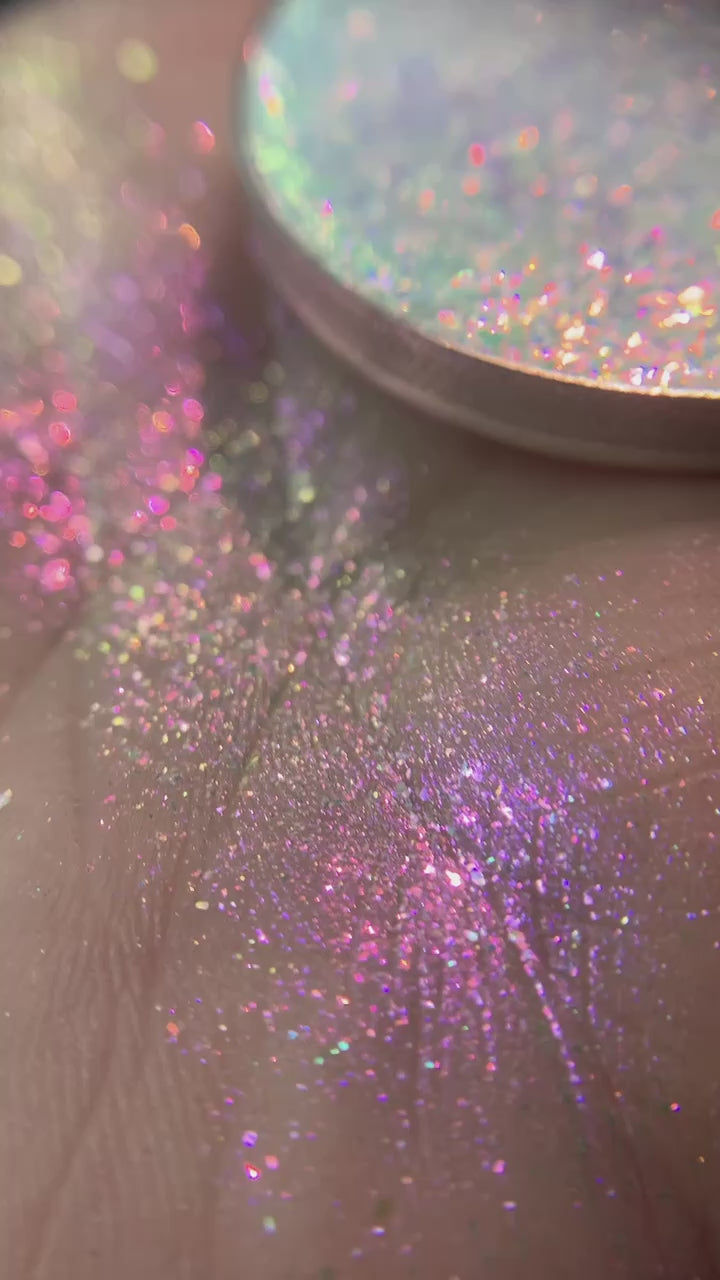 I do NOT recommend going in hard with a fluffy highlighter brush as you will get lots of fall out, because of the different larger particle sizes! Please use a smaller dense brush and pat and dab it into the skin, or my favorite way to apply.. with your finger. It will work best using tap, dab and pull motions to blend it into the skin. (on the face or eyes), especially after spraying the face with a hydrating or setting spray. Build to your desired opacity, and just watch the beautiful glow and color shifts create an ethereal galaxy on your face! 🤩🥳✨✨