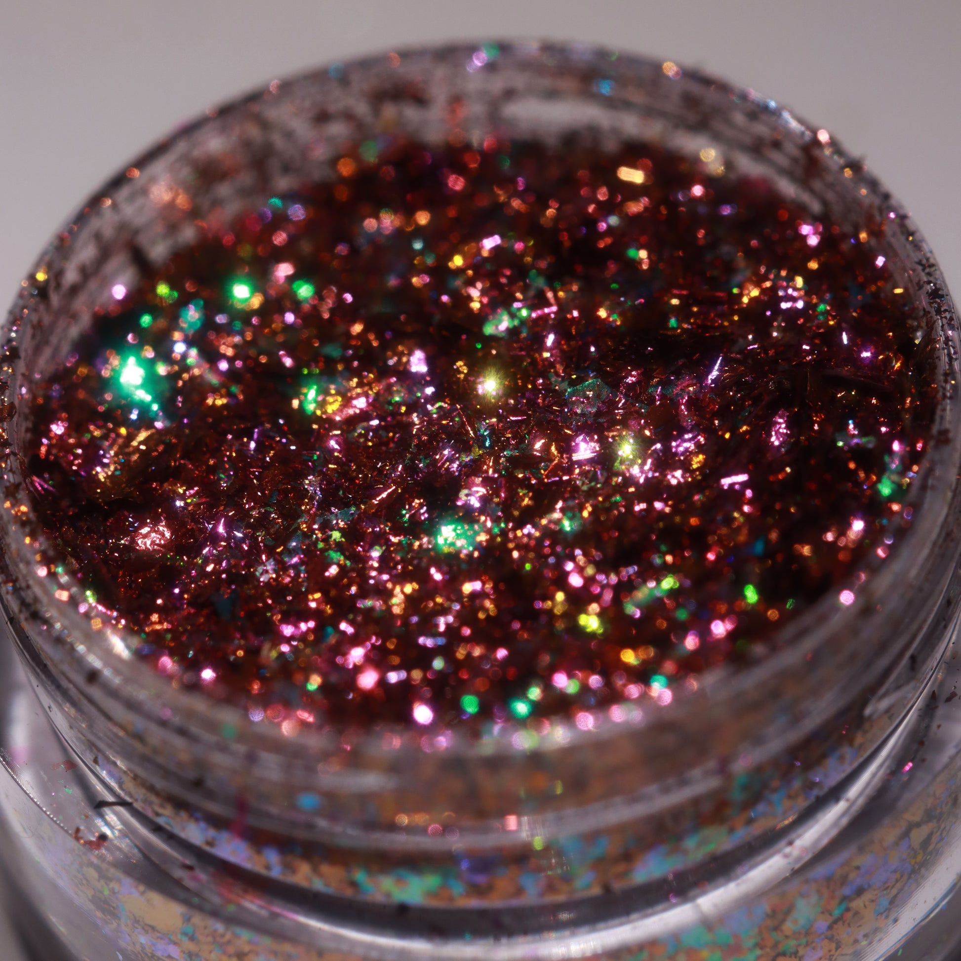 Rhea looks like a sunset that got lost in deep space. She shifts through pink, orange, gold, green, teal, and purple, packed with color-shifting multidimensional sparkles that refuse to pick just one mood. Soft, slightly flaky, and unapologetically extra.