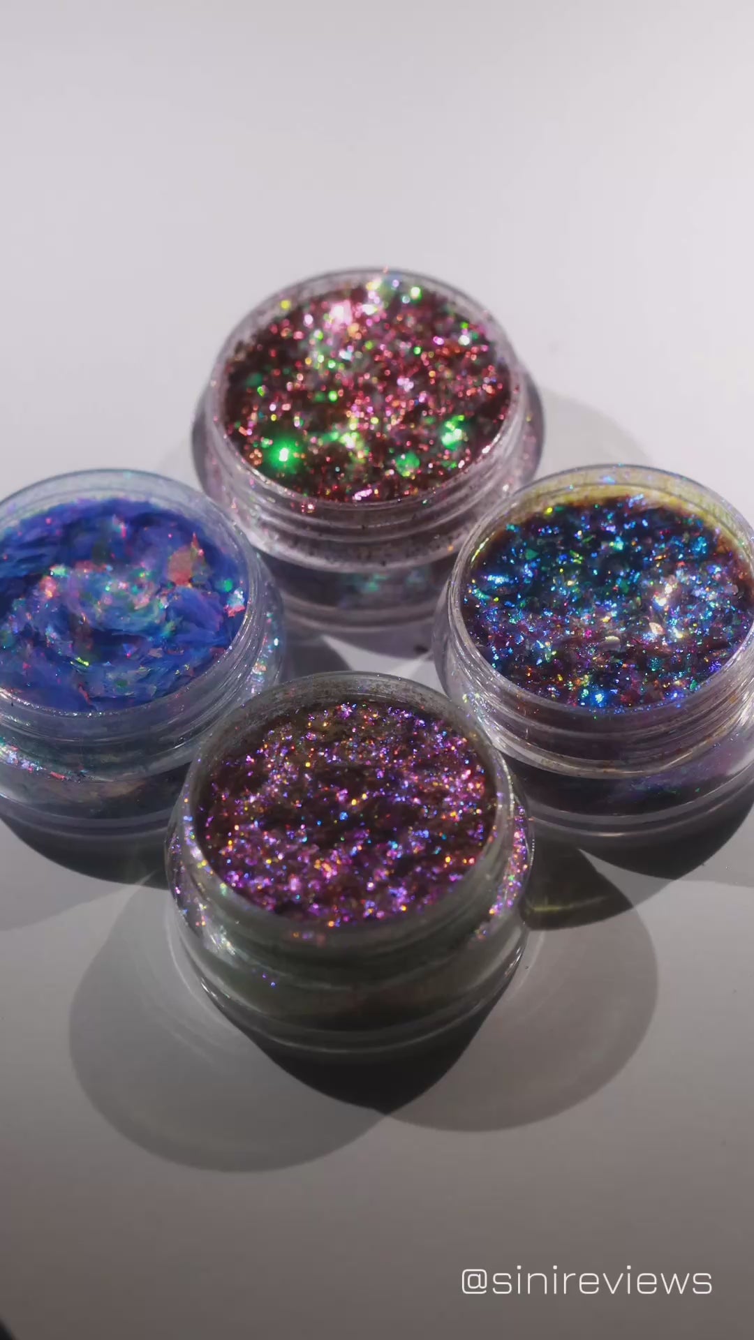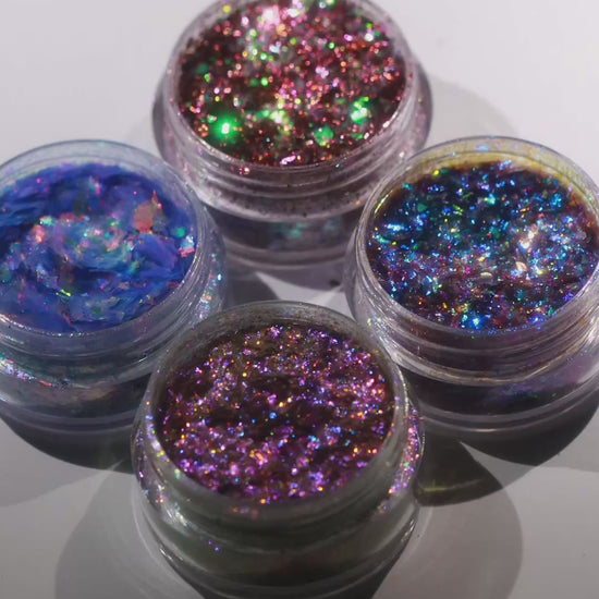 Meet the chaotic cousins of the Cosmic Shift palette — four custom multicolored multichrome flake blends packed into 5g jars, filled right to the rim with prismatic, shape-shifting sparkle.