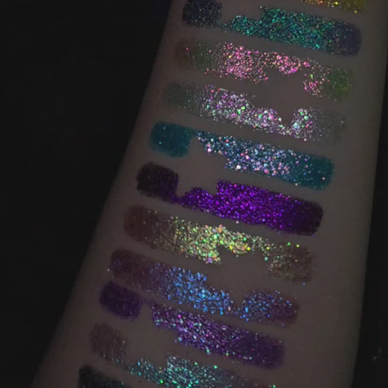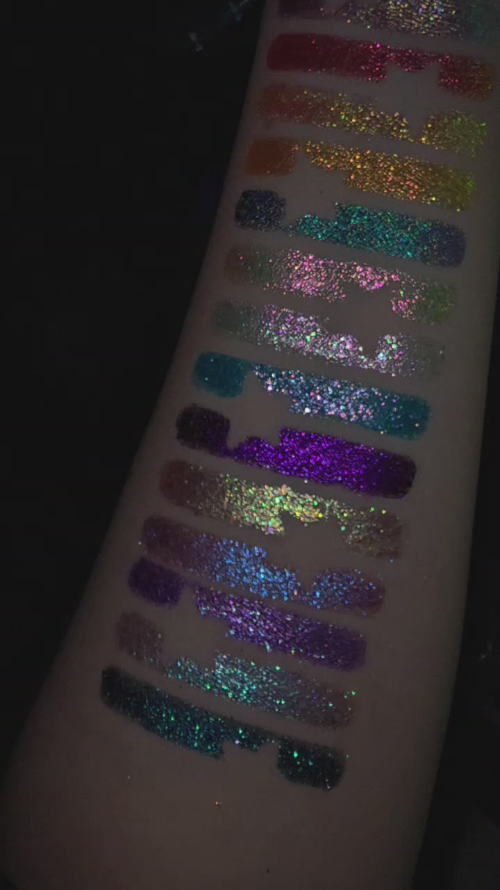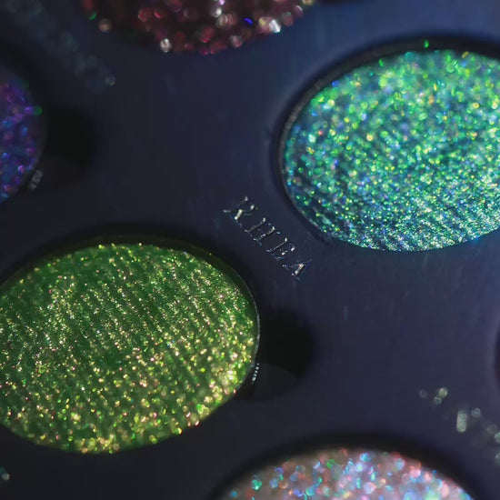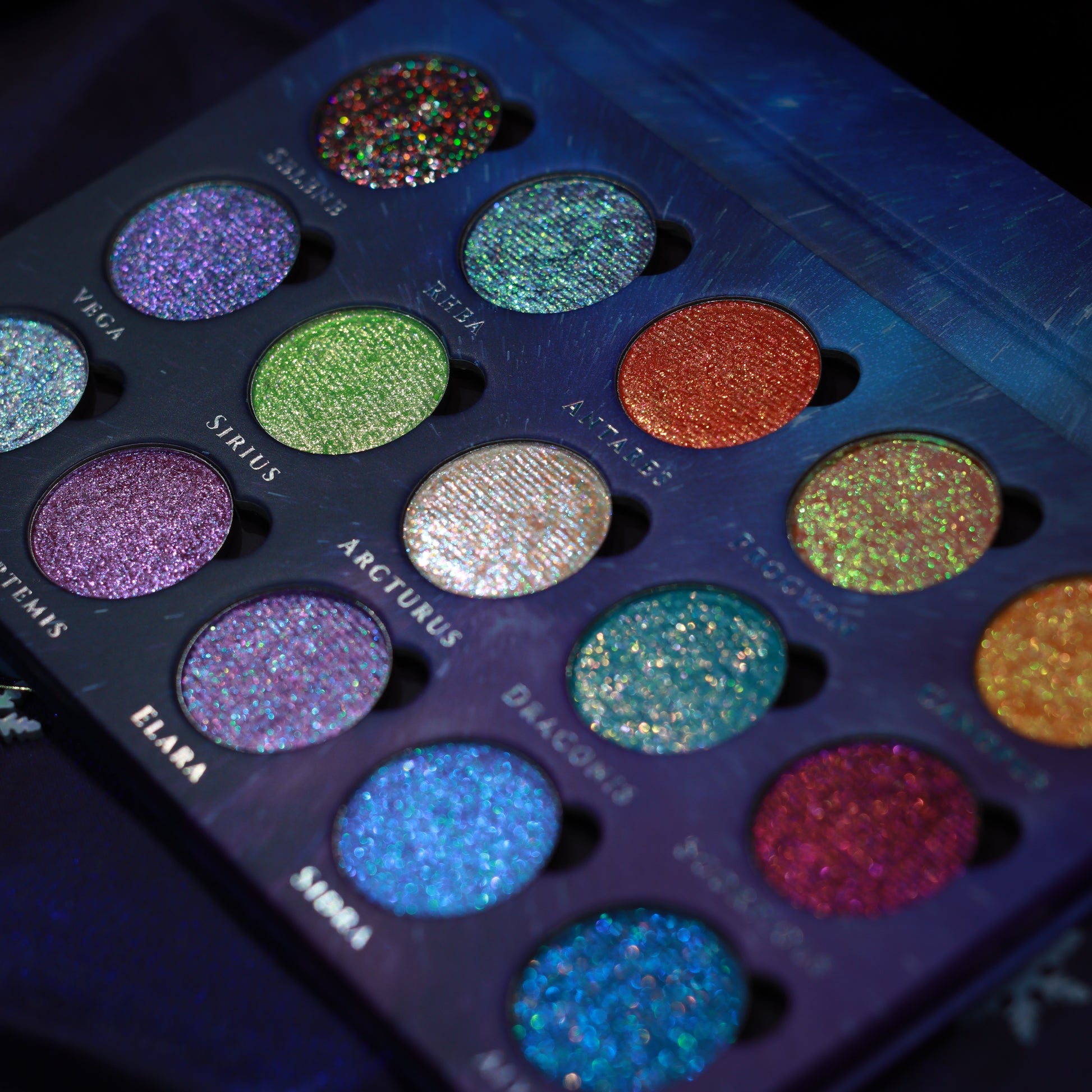 Every shade is a tiny galaxy of its own — the colors you see will change depending on your base, lighting, and how you tap them on. Over a tacky base or glitter primer, they light up with intense, high-impact shifts that make it look like you layered multiple shadows… when you absolutely did not.