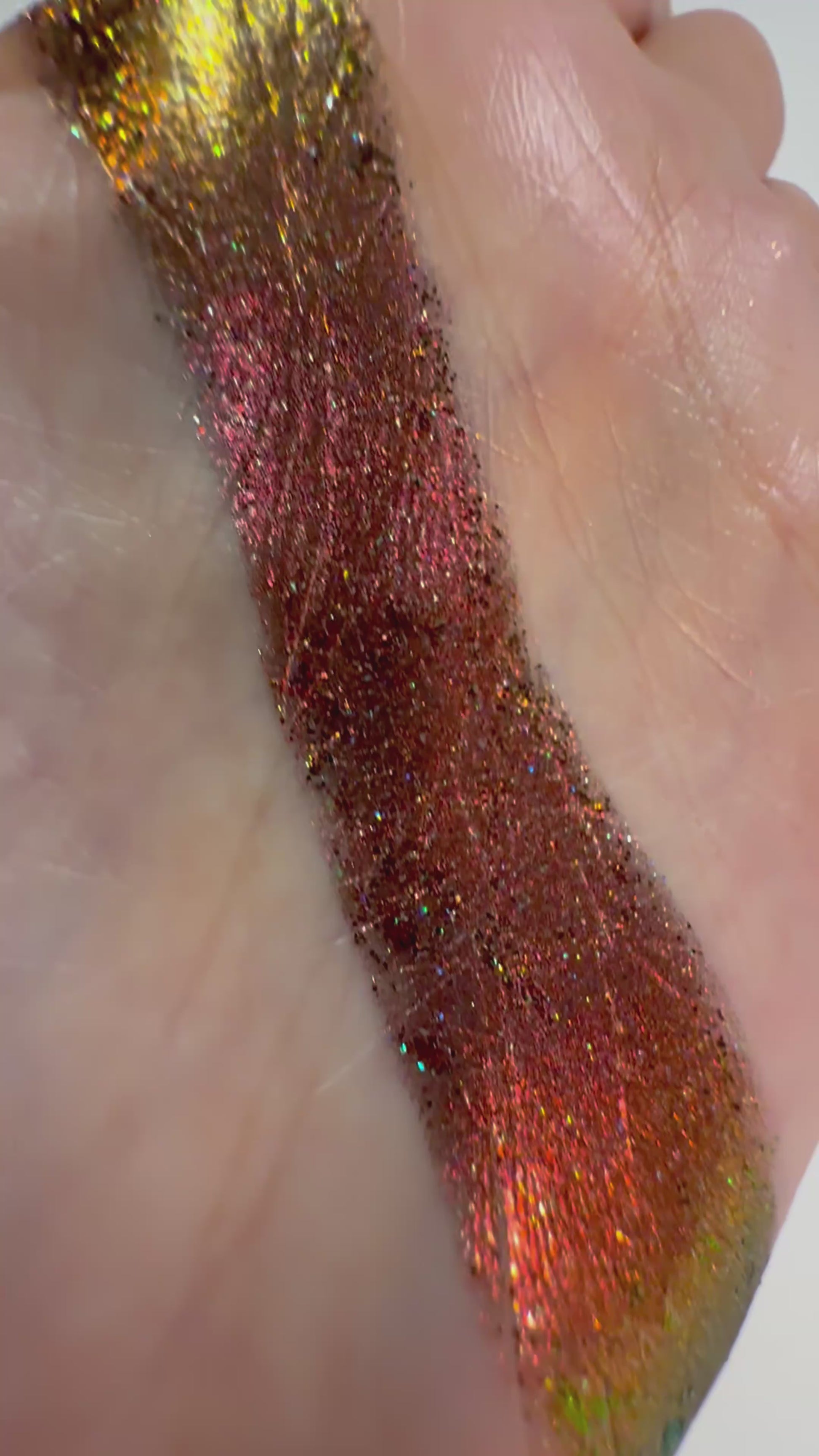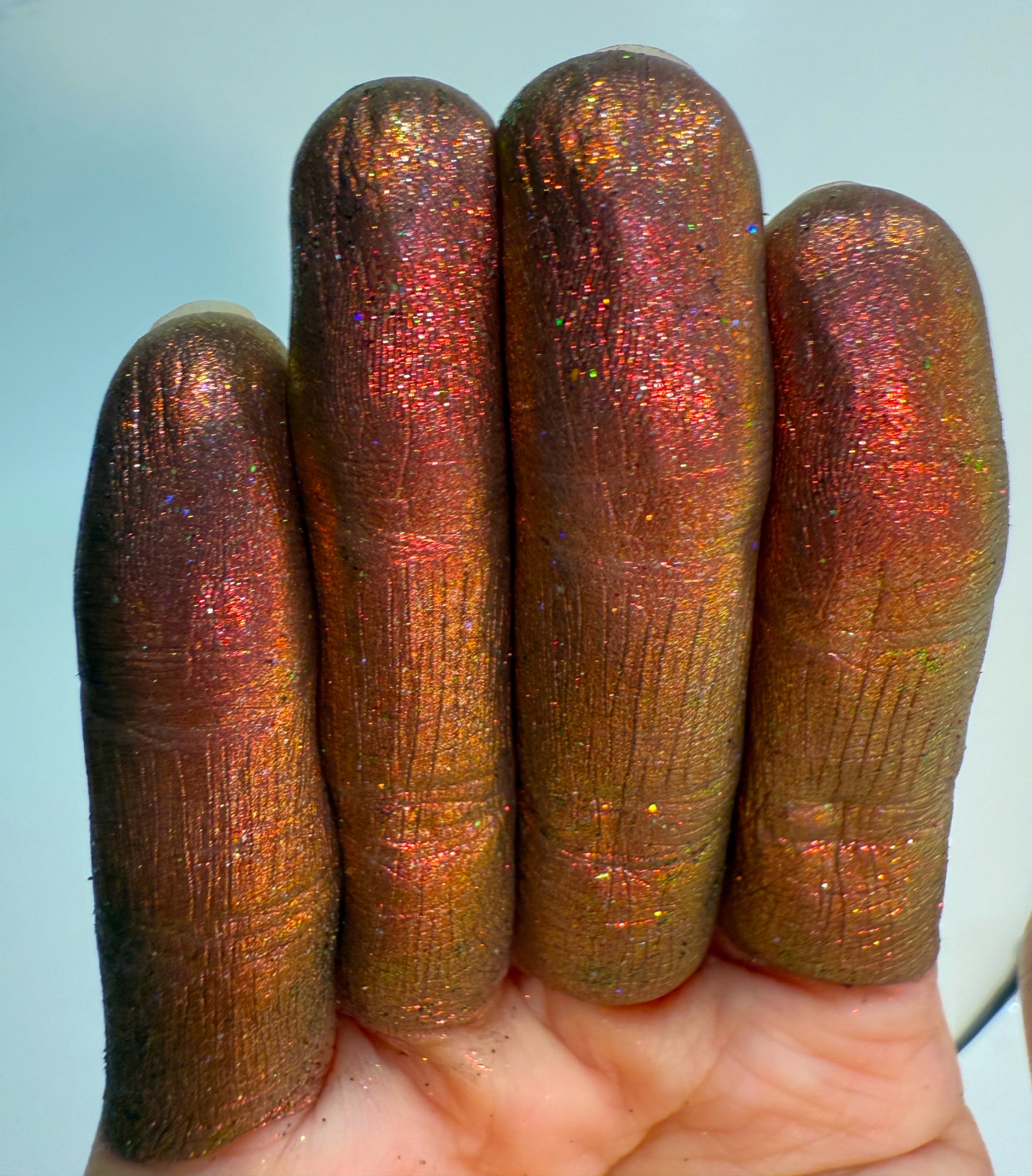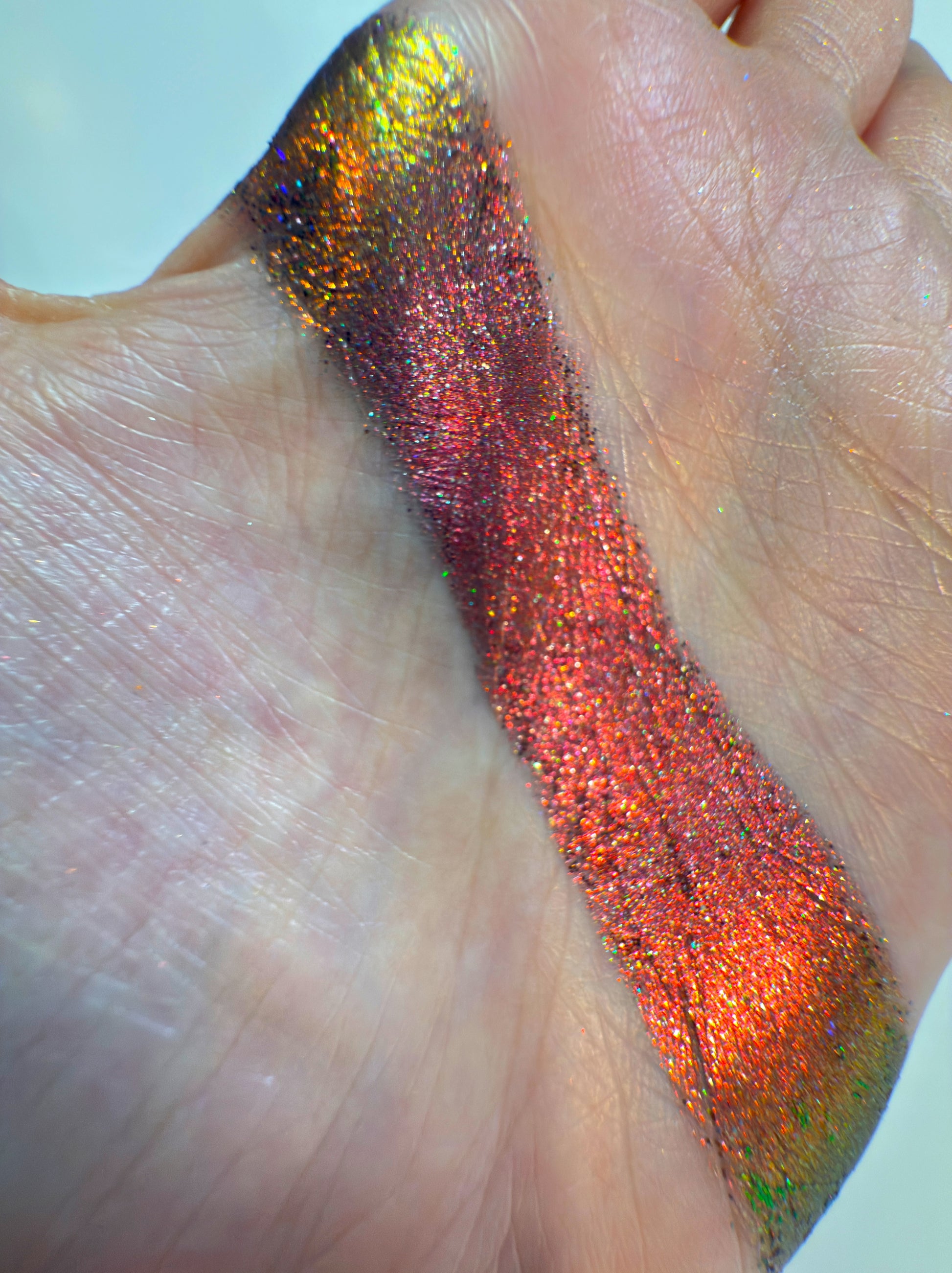 It’s a full-blown molten multichrome meltdown that shifts from fiery red to molten orange to searing gold and green — like heat vision with a glitter obsession.