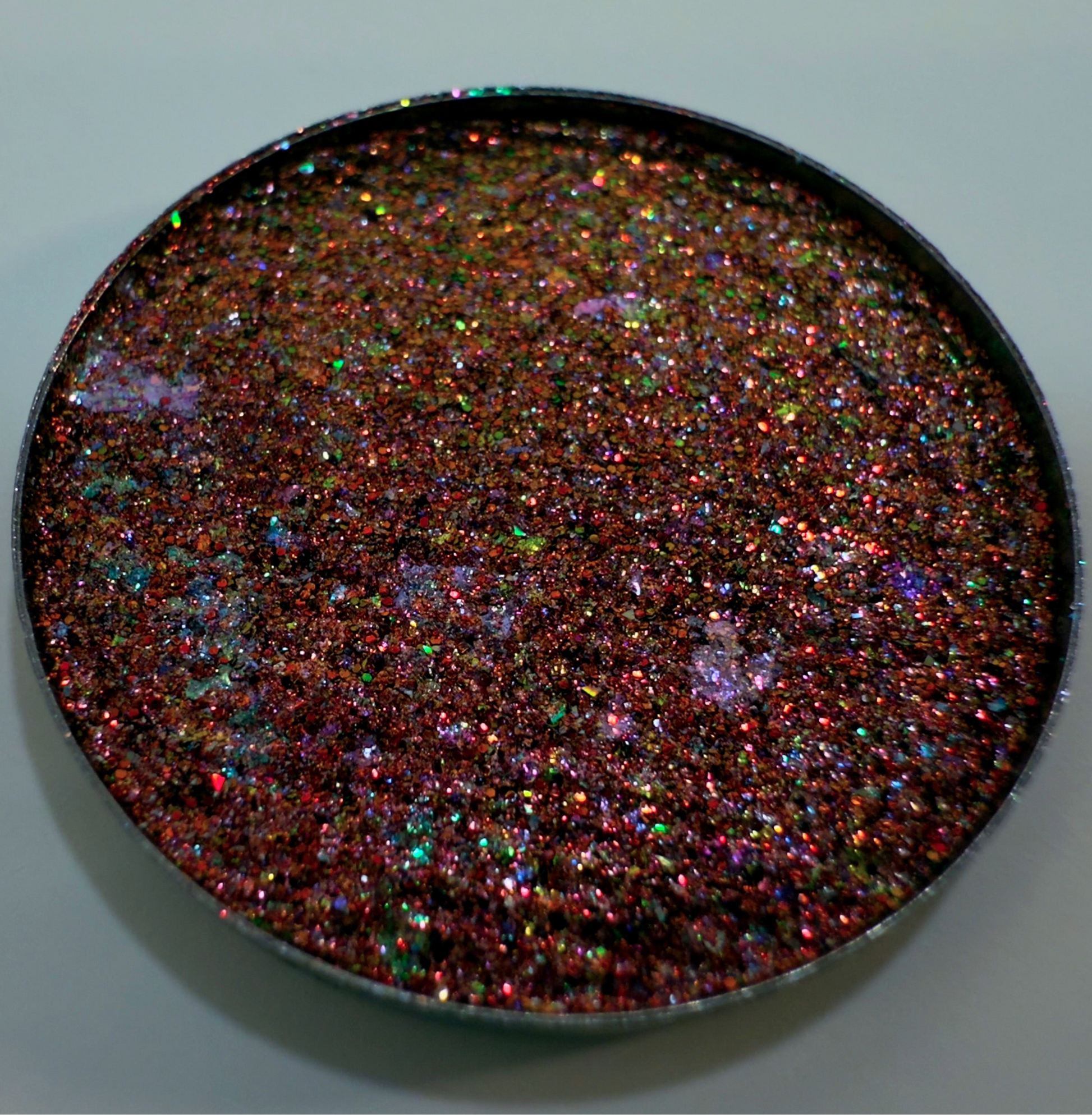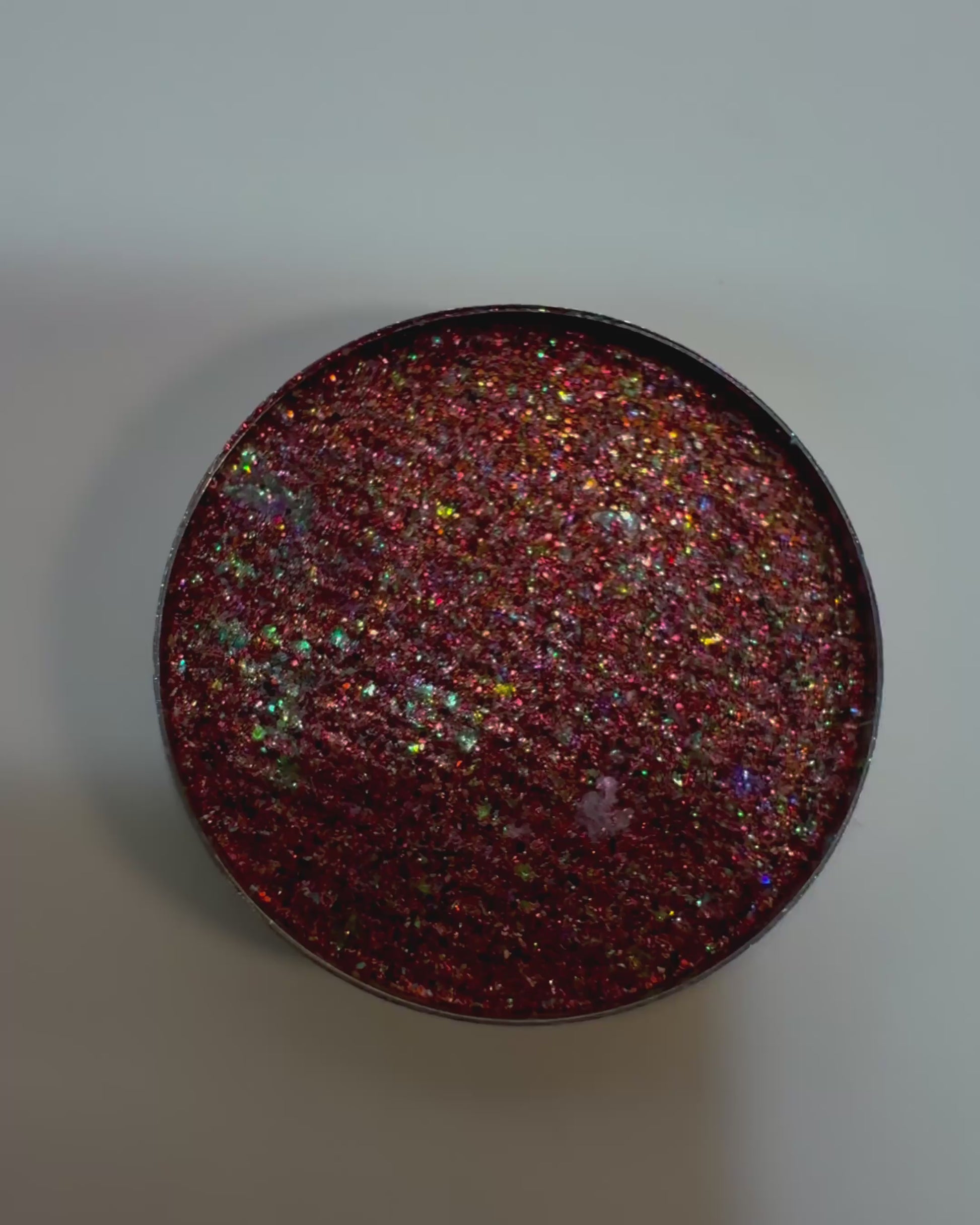 Fire Hazard is a truly special hybrid eyeshadow — a custom-made Extreme Multichrome fused with loads of holographic & multicolored sparkle, multichrome glitter, and multichrome flakes, creating a molten, multidimensional eruption of color.