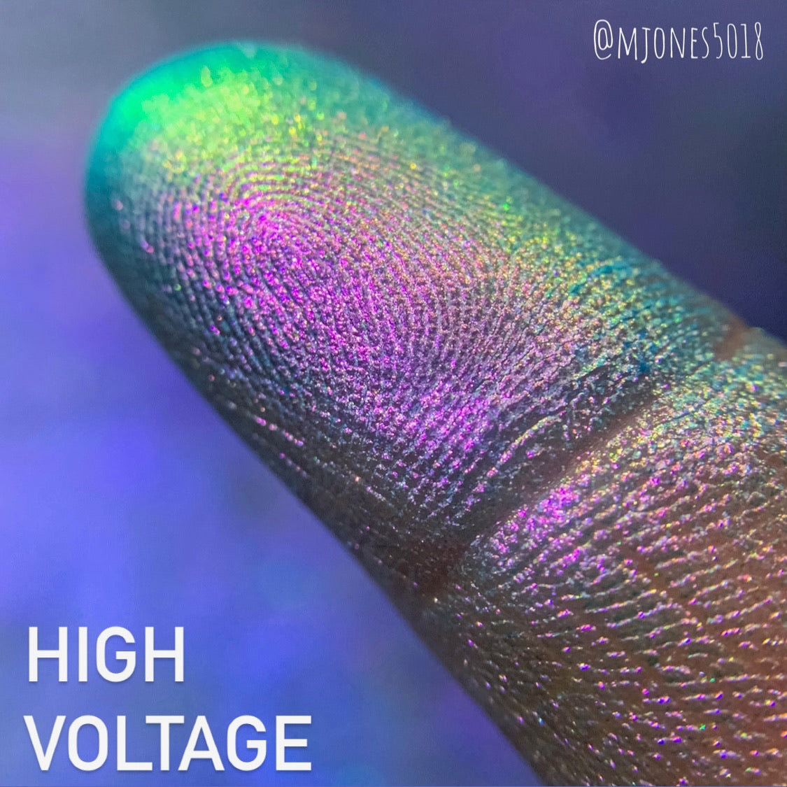 - HIGH VOLTAGE - is a smooth, violet to pink to peach to gold to green to bright emerald green to teal multichrome.
