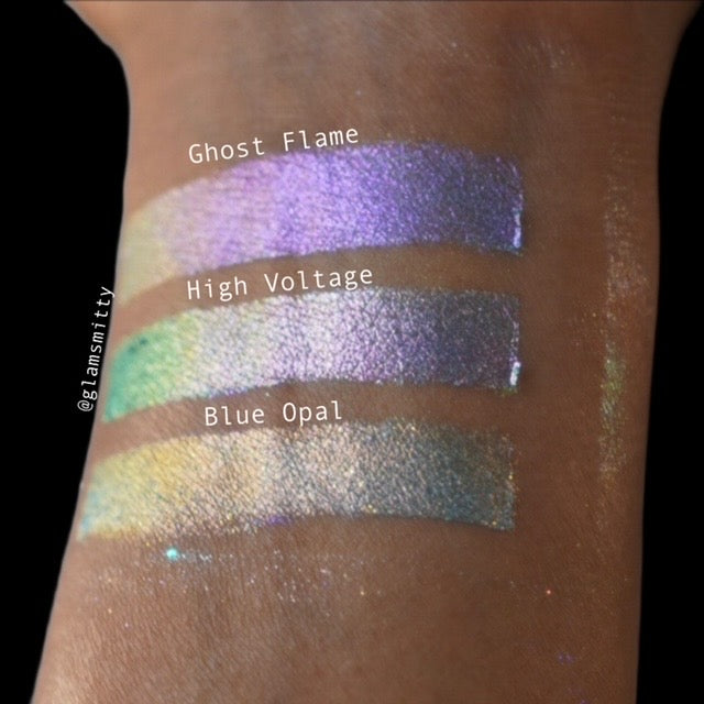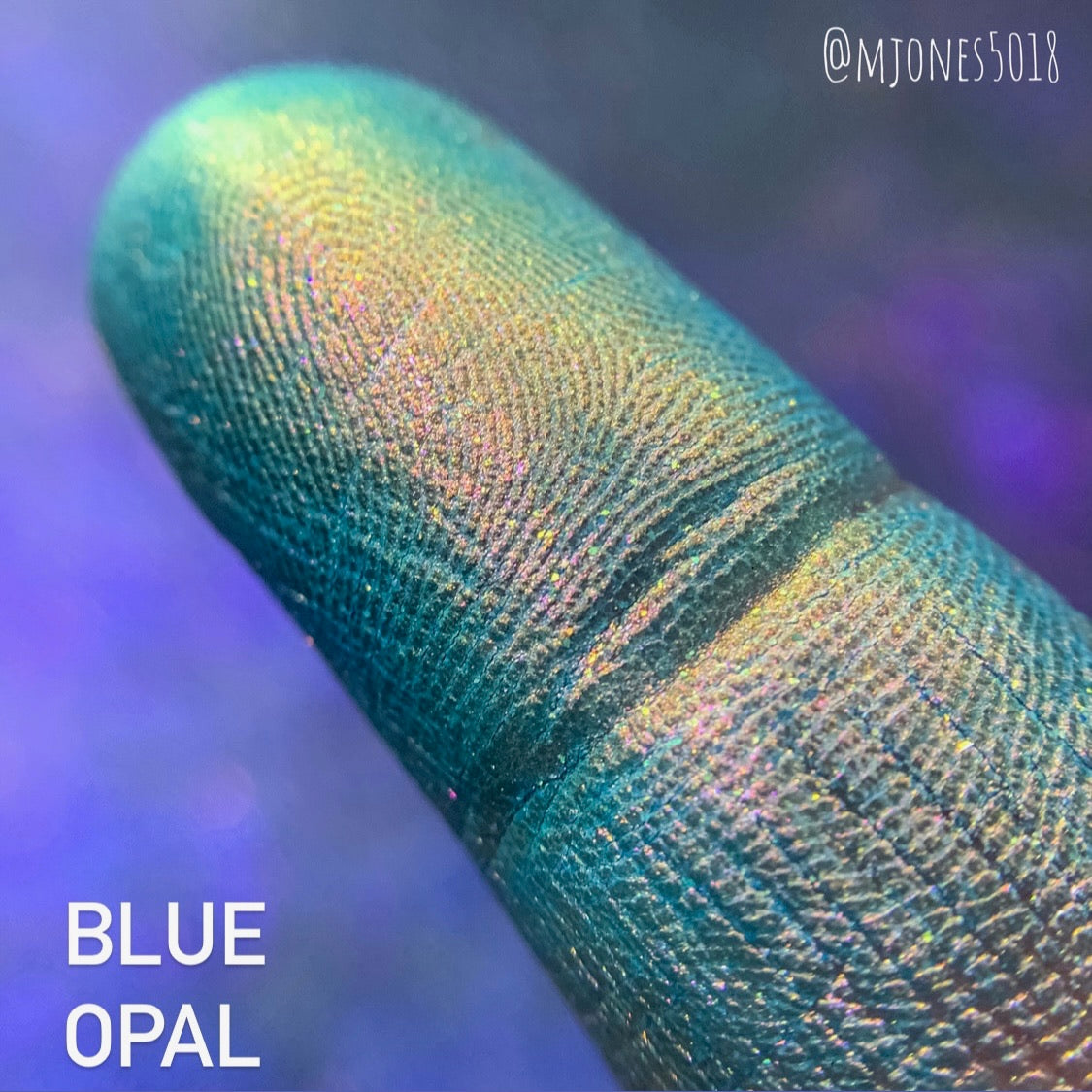 - BLUE OPAL - is a smooth, blue to muted orange to pink to gold to light green multichrome with lots of multi shifting sparkles infused.
