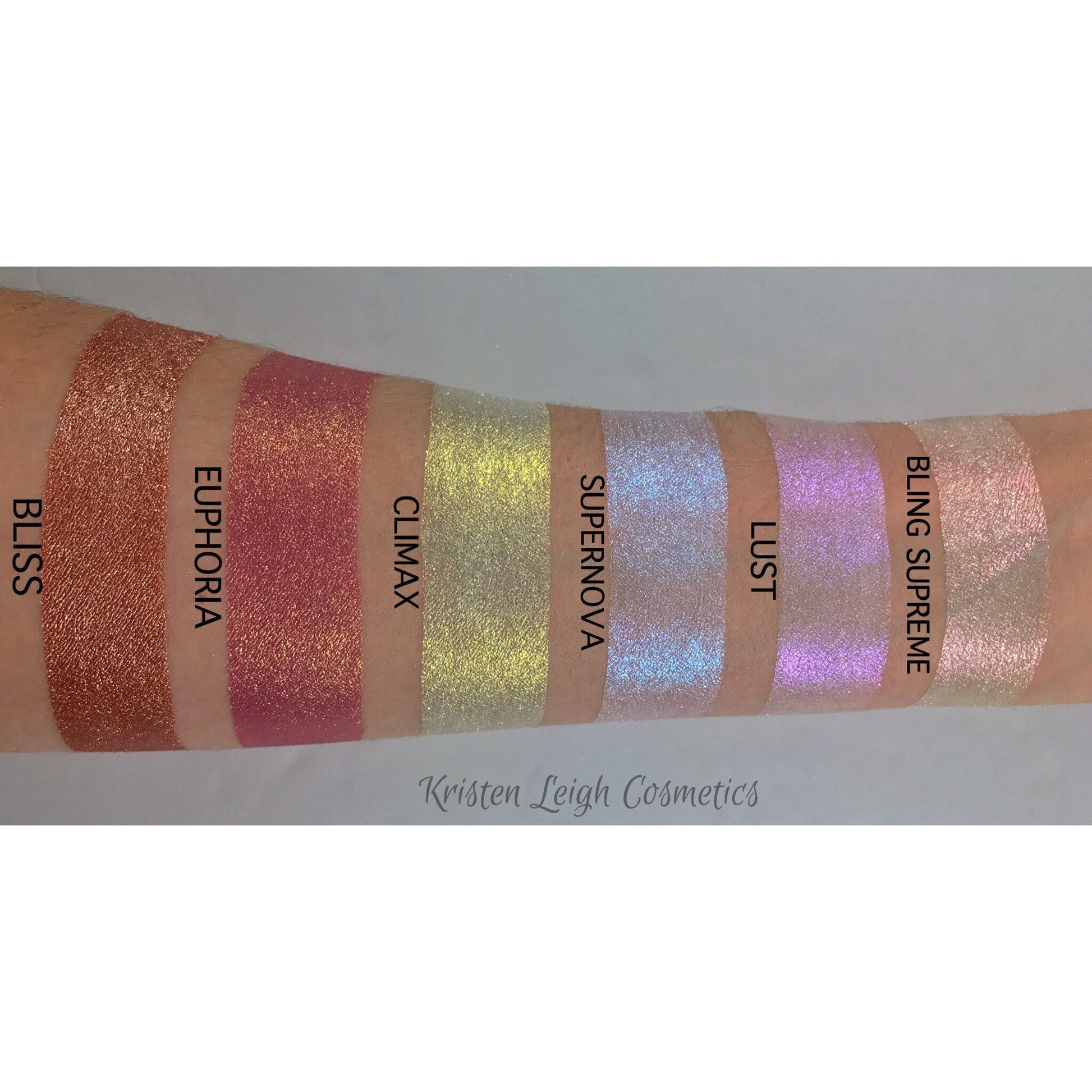 CLIMAX - A stunning super pigmented, sparkly, iridescent gold highlighter. Great for all skin tones. If you’re looking for that show stopping gold highlighter, and you love sparkles...THIS IS IT!!