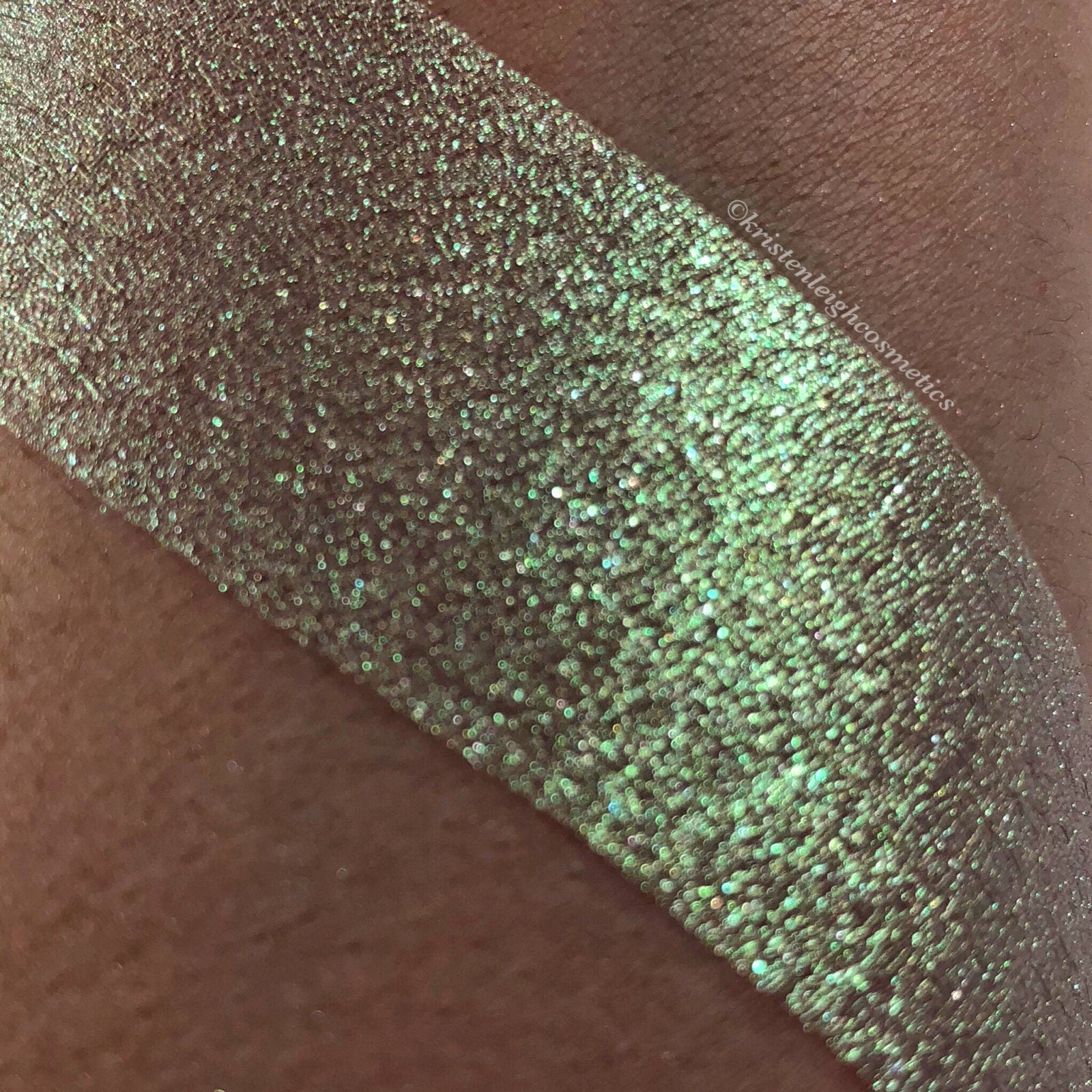 MONEY HUNGRY - A sparkly green to sight gold iridescent duochrome highlighter, Great for all skin tones. (scroll to see the swatch)