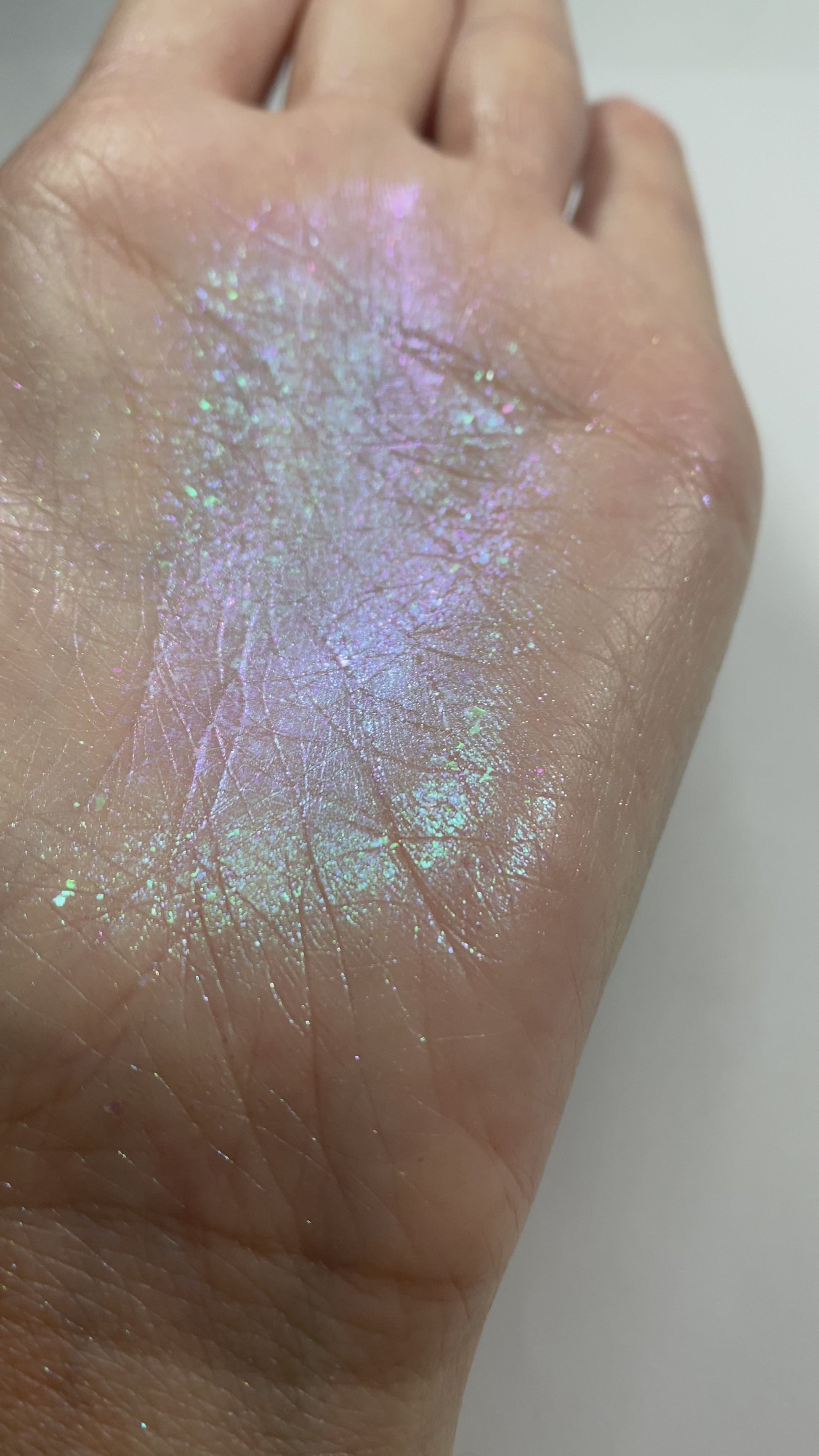 As you can see, this formula is a larger particle size than our normal eyeshadows and highlighters, but with a few taps and blends of your fingers it works into the skin so beautifully and gives a glass like glow!