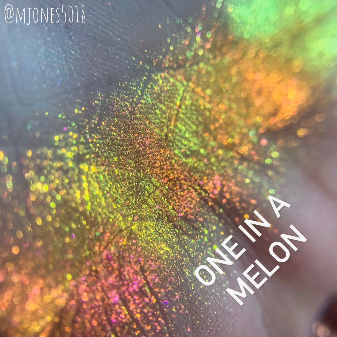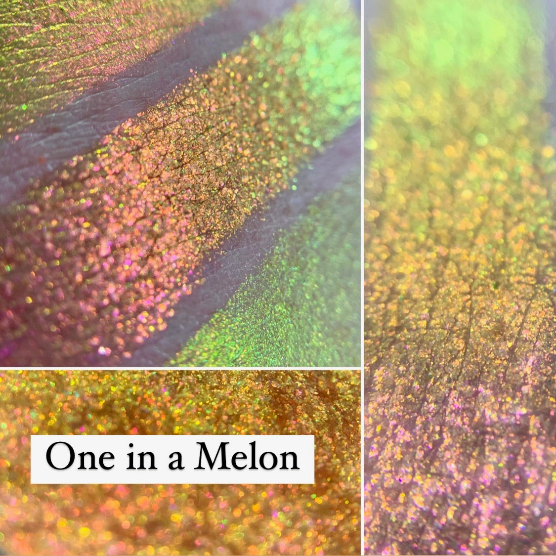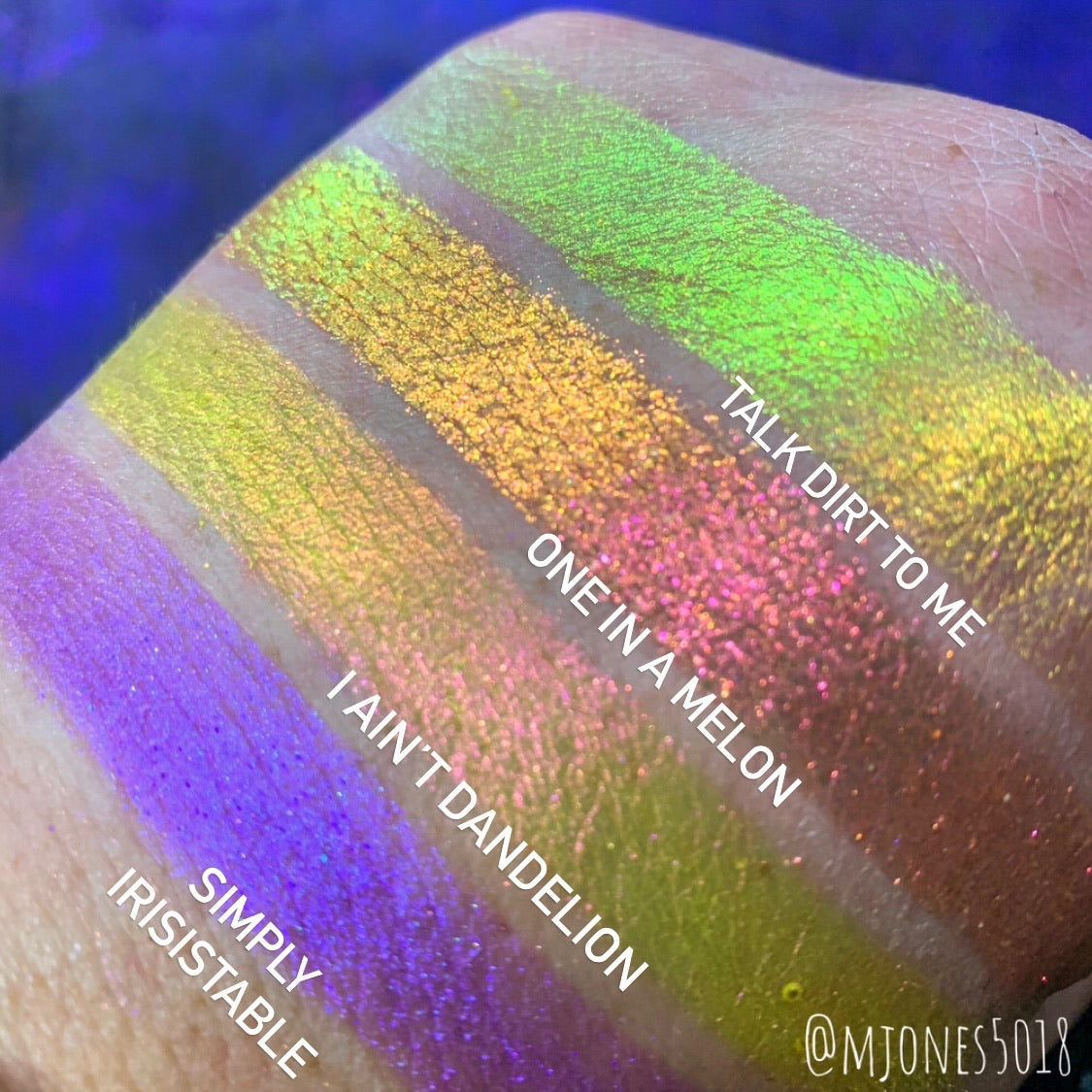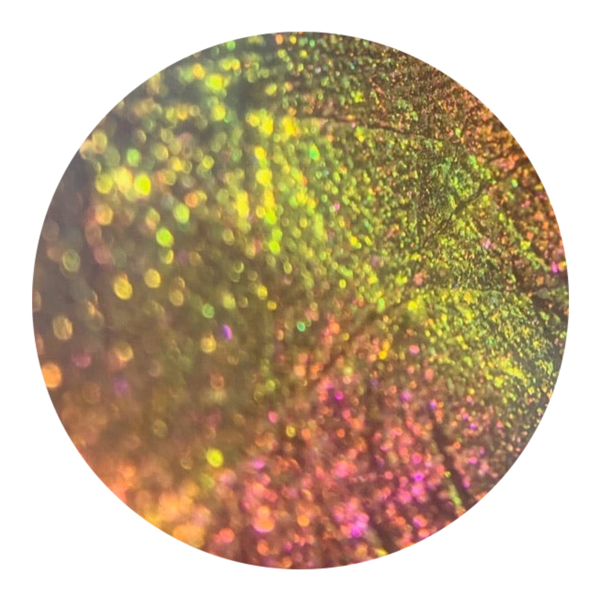 A slightly larger particle - Iridescent green to blue to violet to pink to red to orange multichrome highlighter.