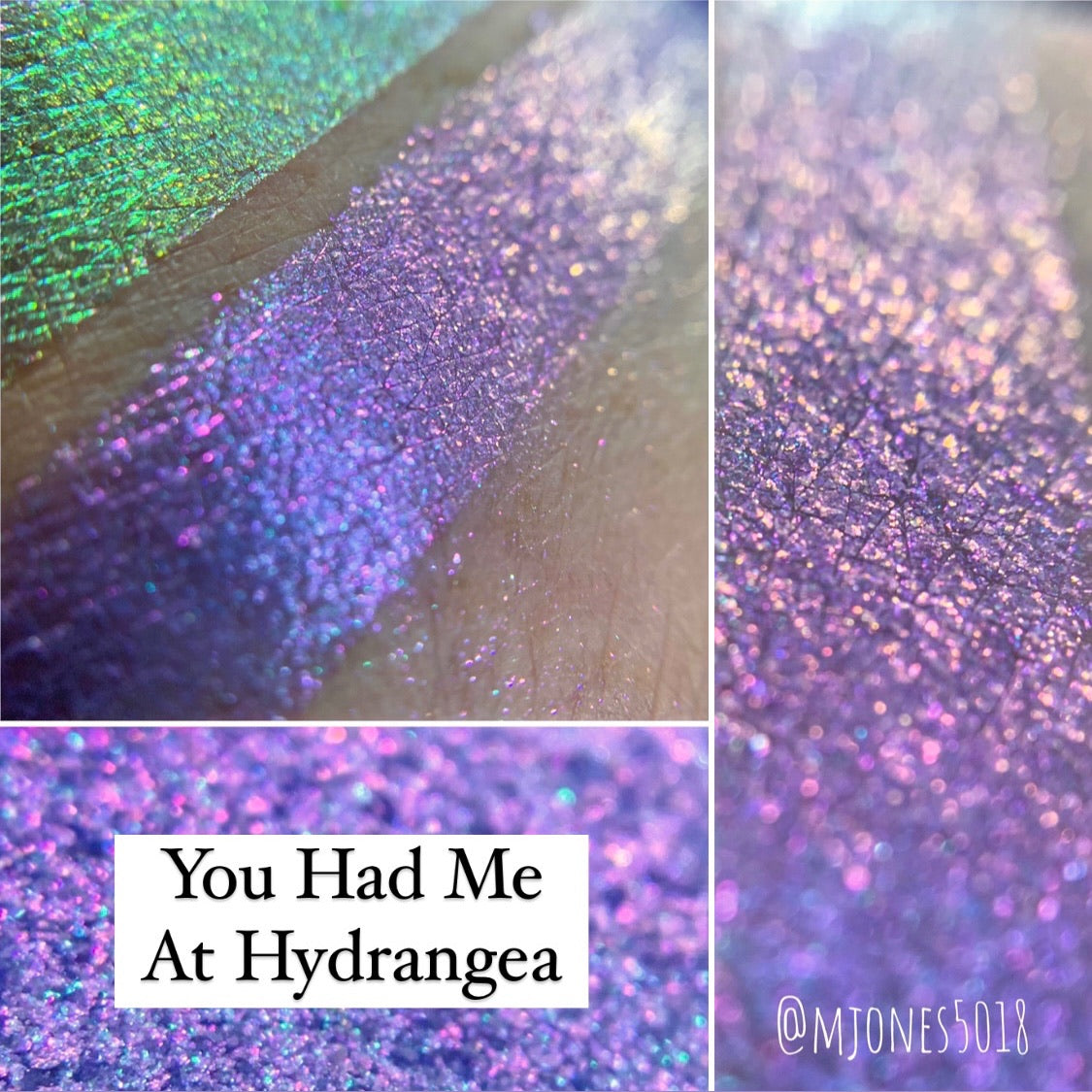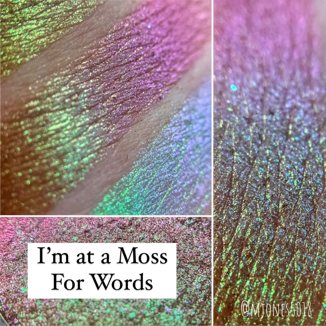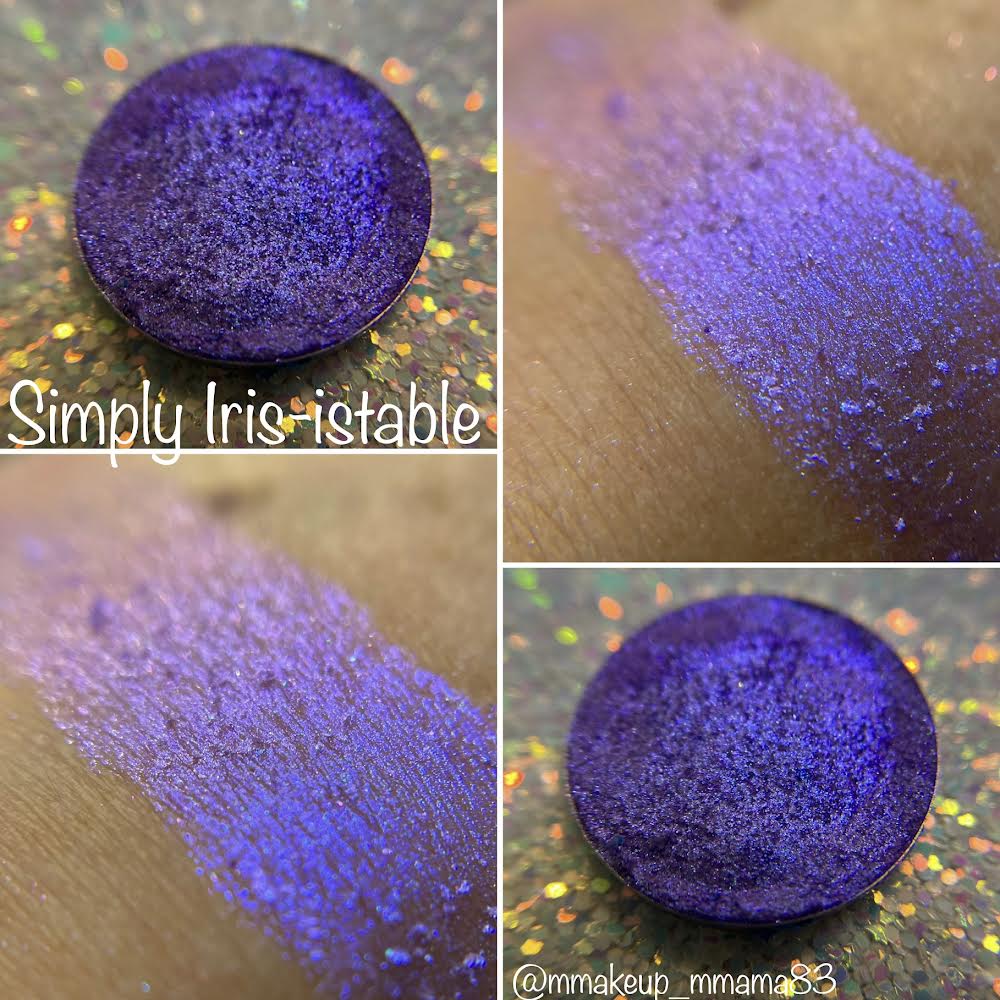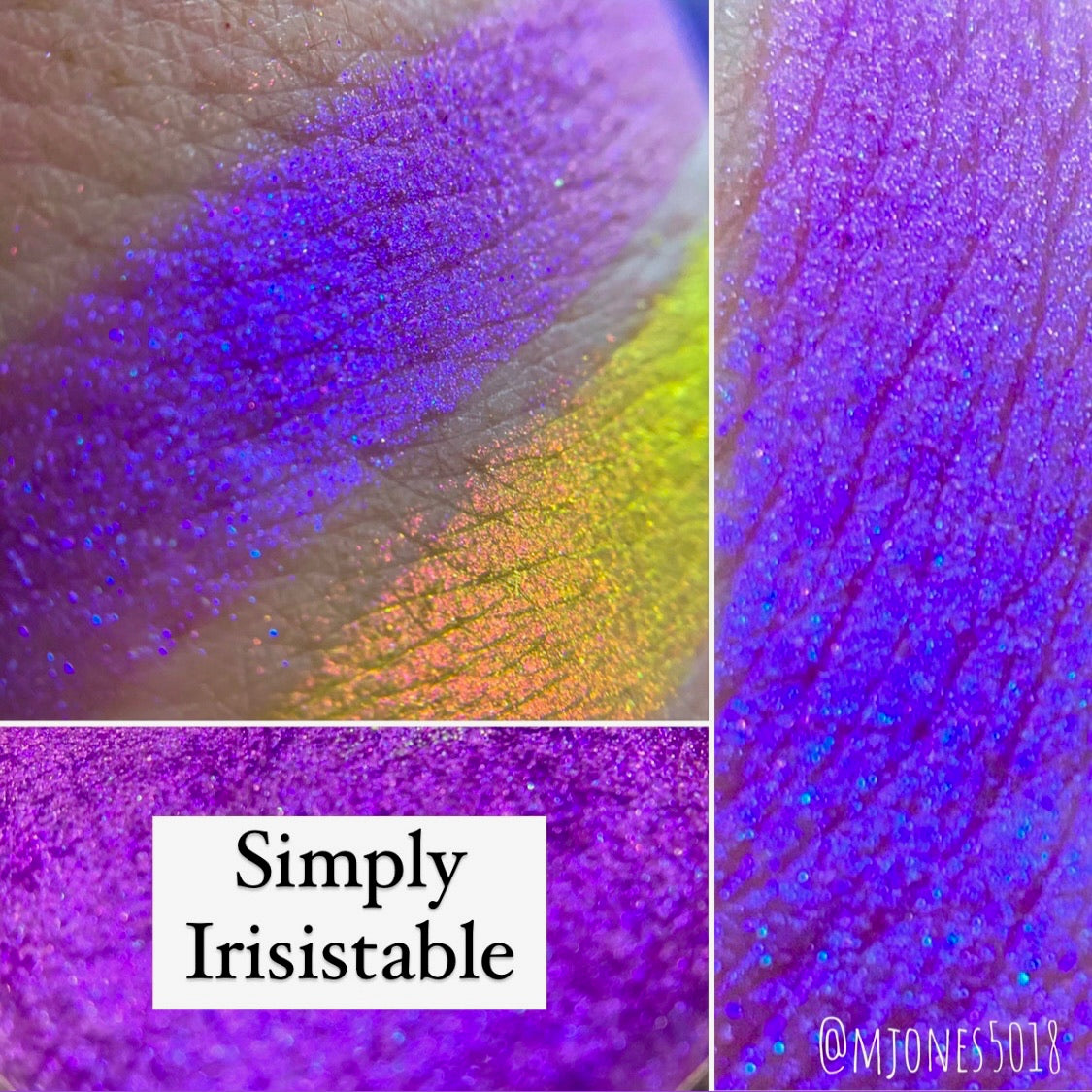 A smooth - Very Iridescent Indigo to purple to muted pink multichrome. (Use as a topper, or over a black or white base to make the iridescent beauty pop).
