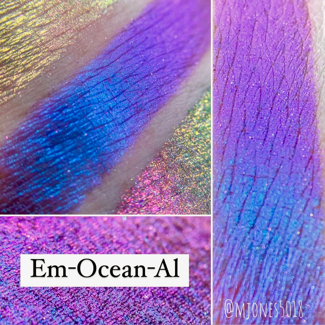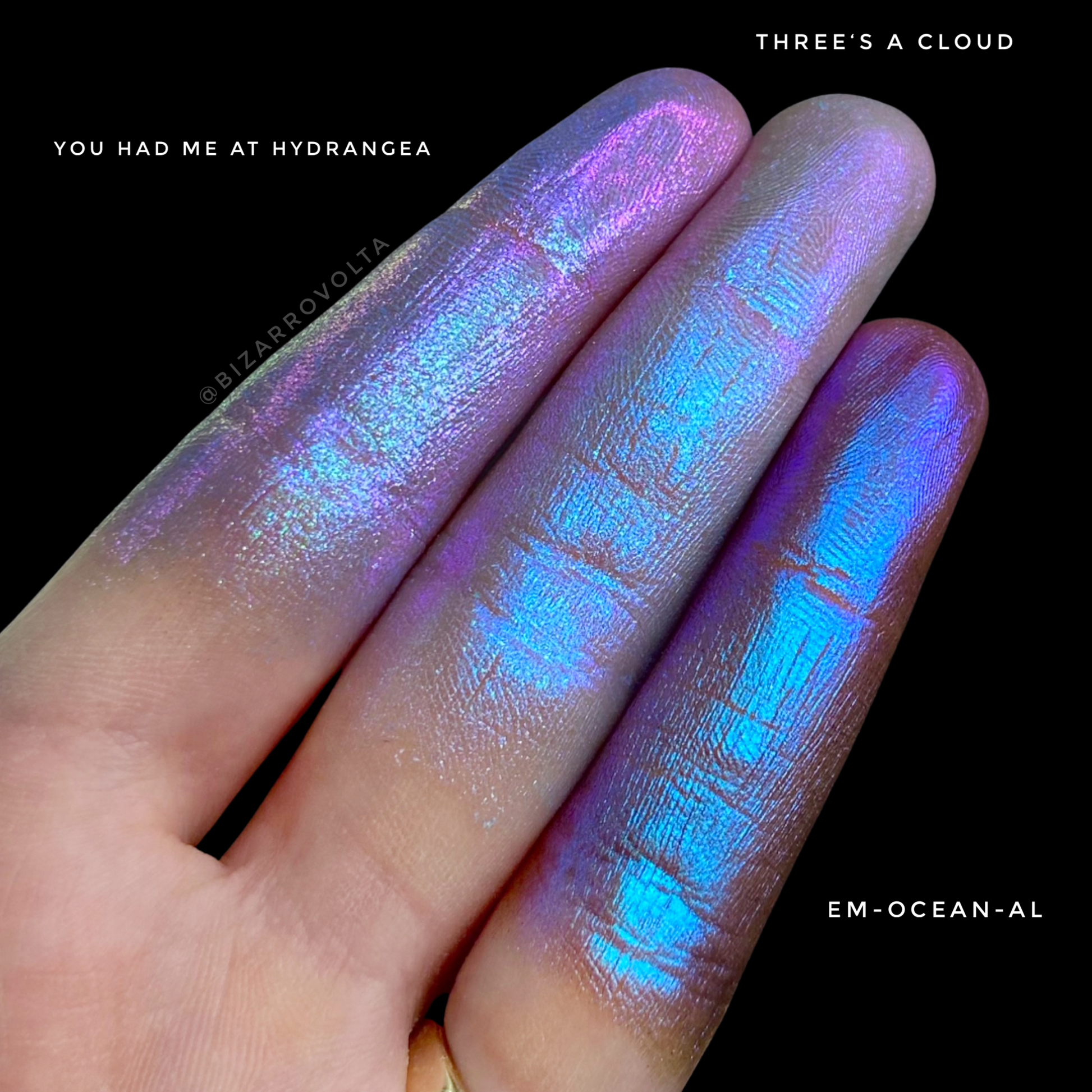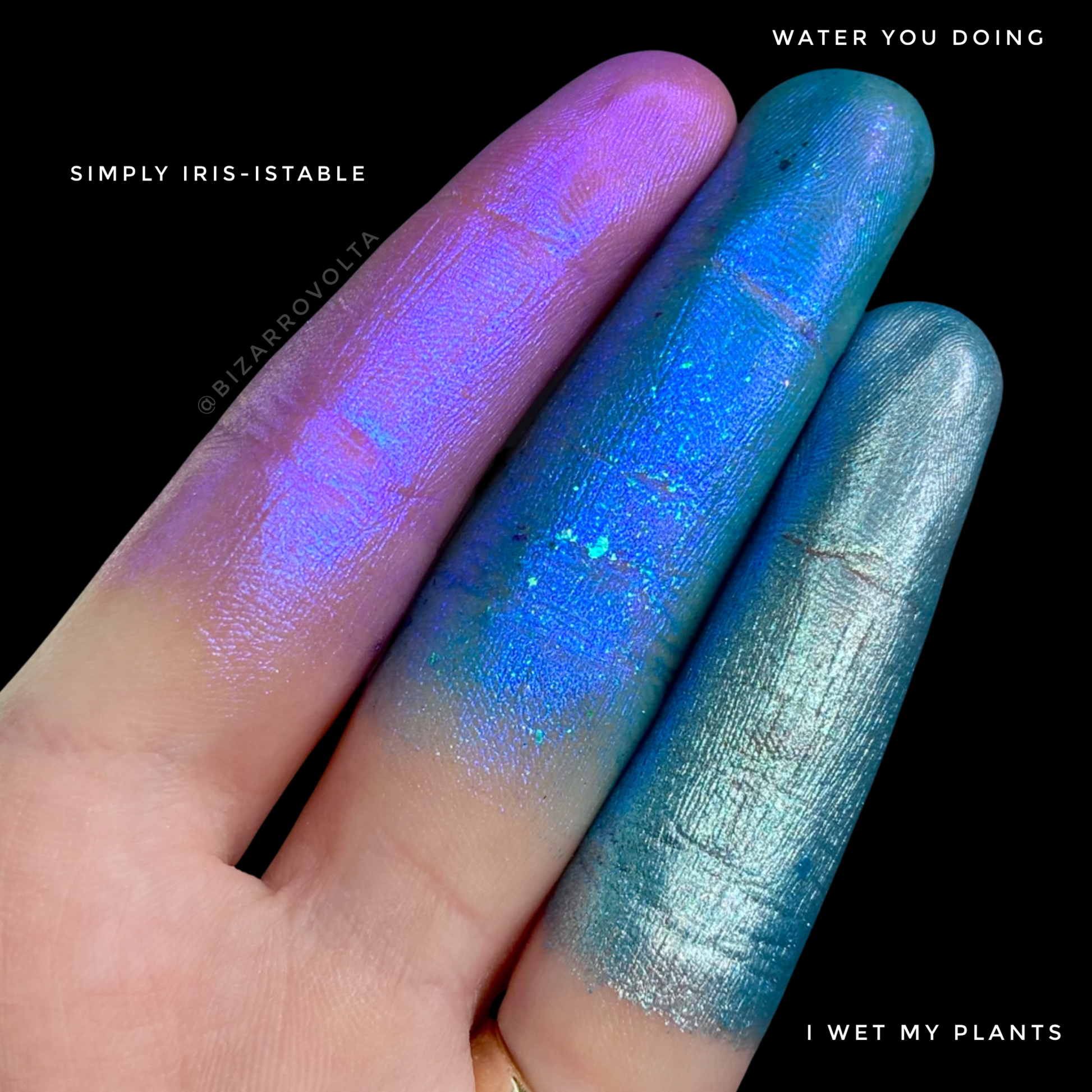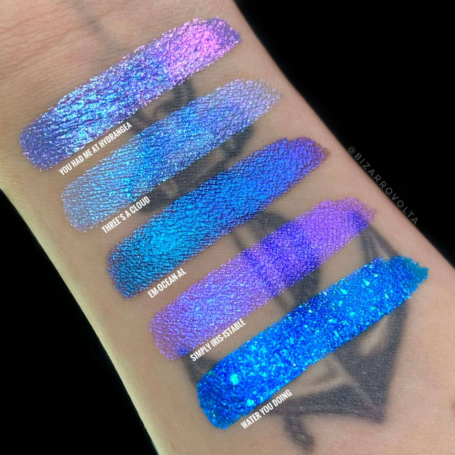 A soft, creamy, flaky - Iridescent cobalt blue to purple to periwinkle to grey multichrome, with teal to purple to pink to orange multichrome flakes. (Use as a topper, or over a black or white base to make the iridescent beauty pop).