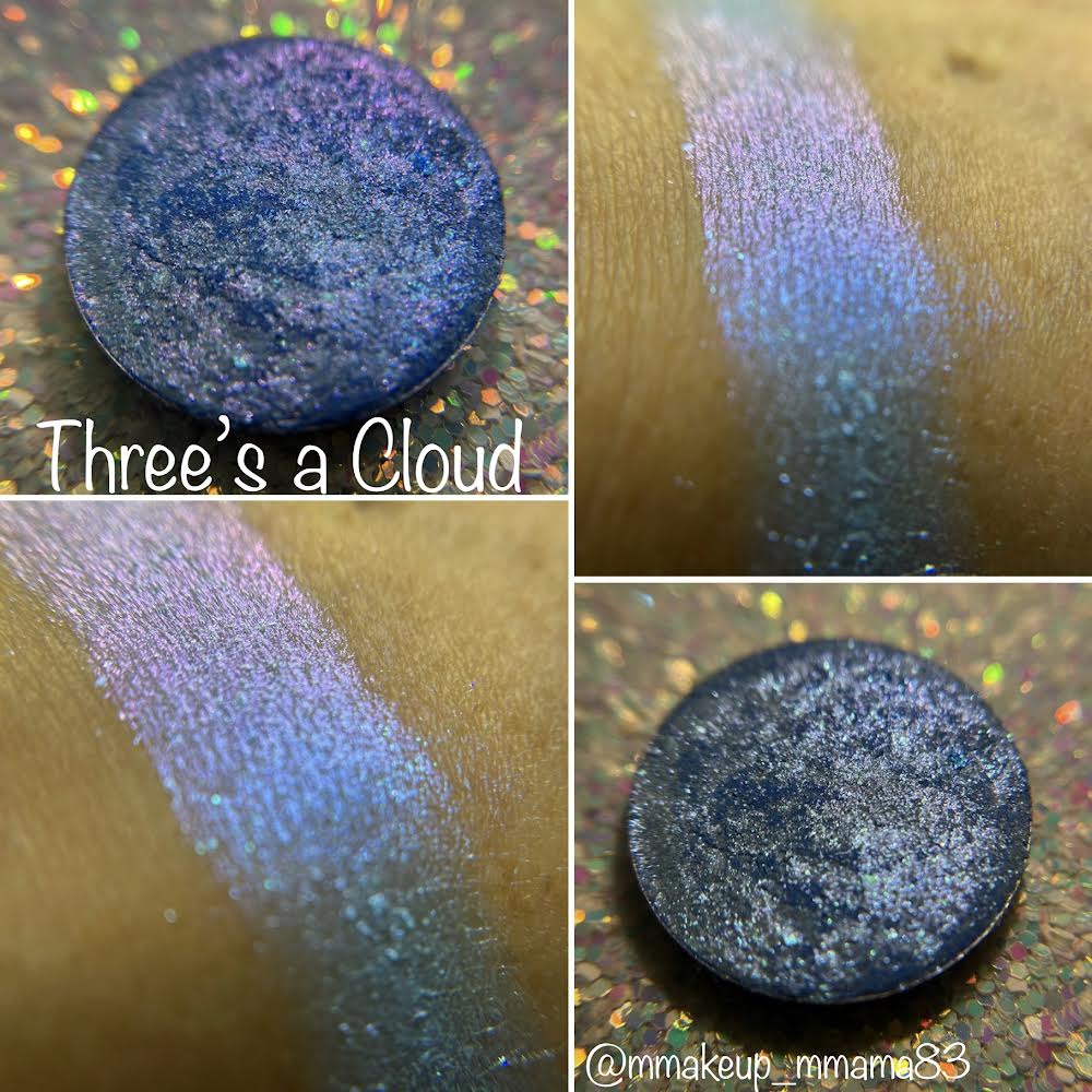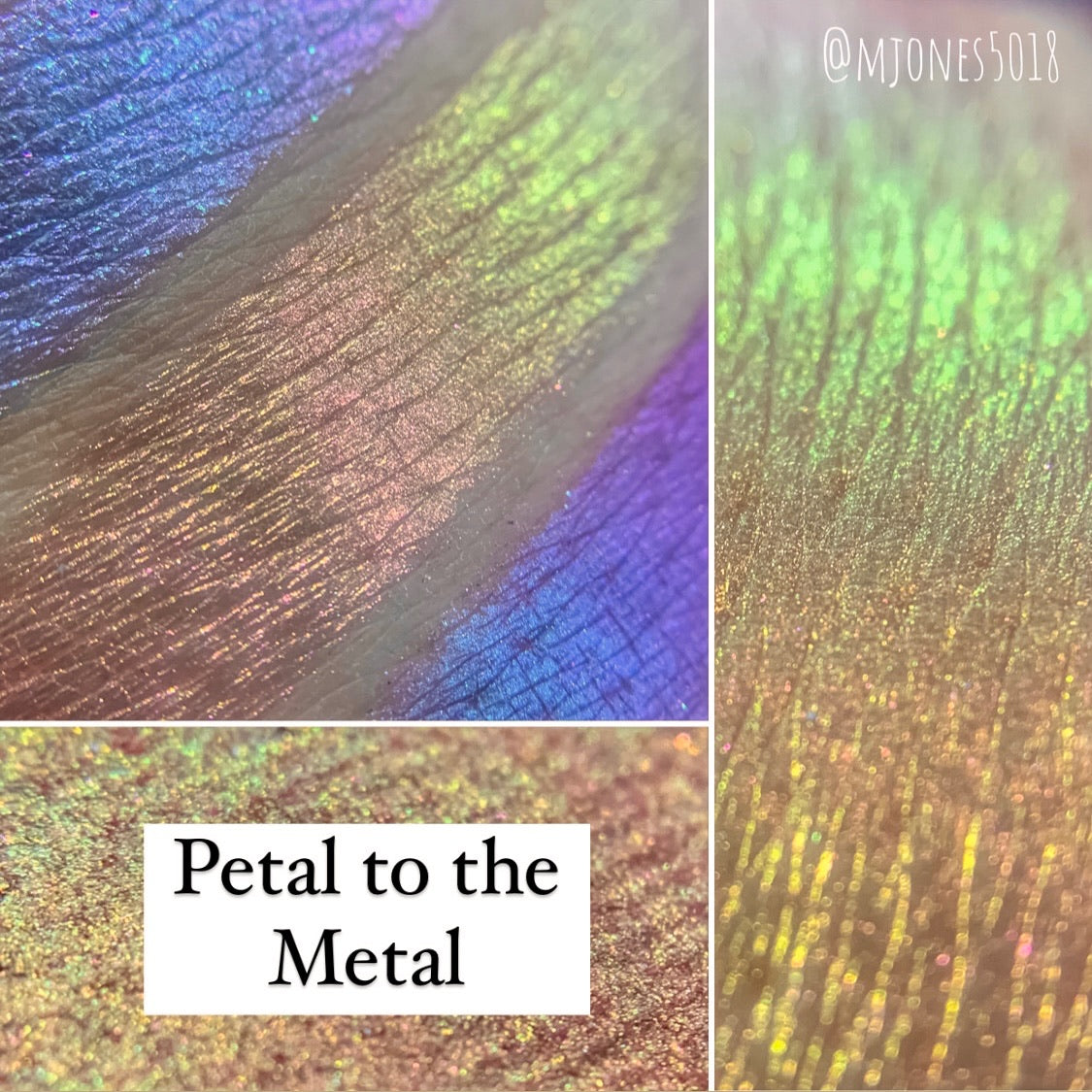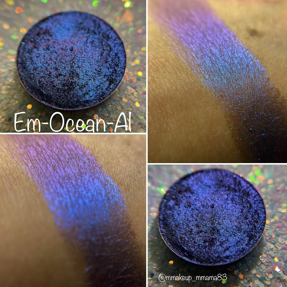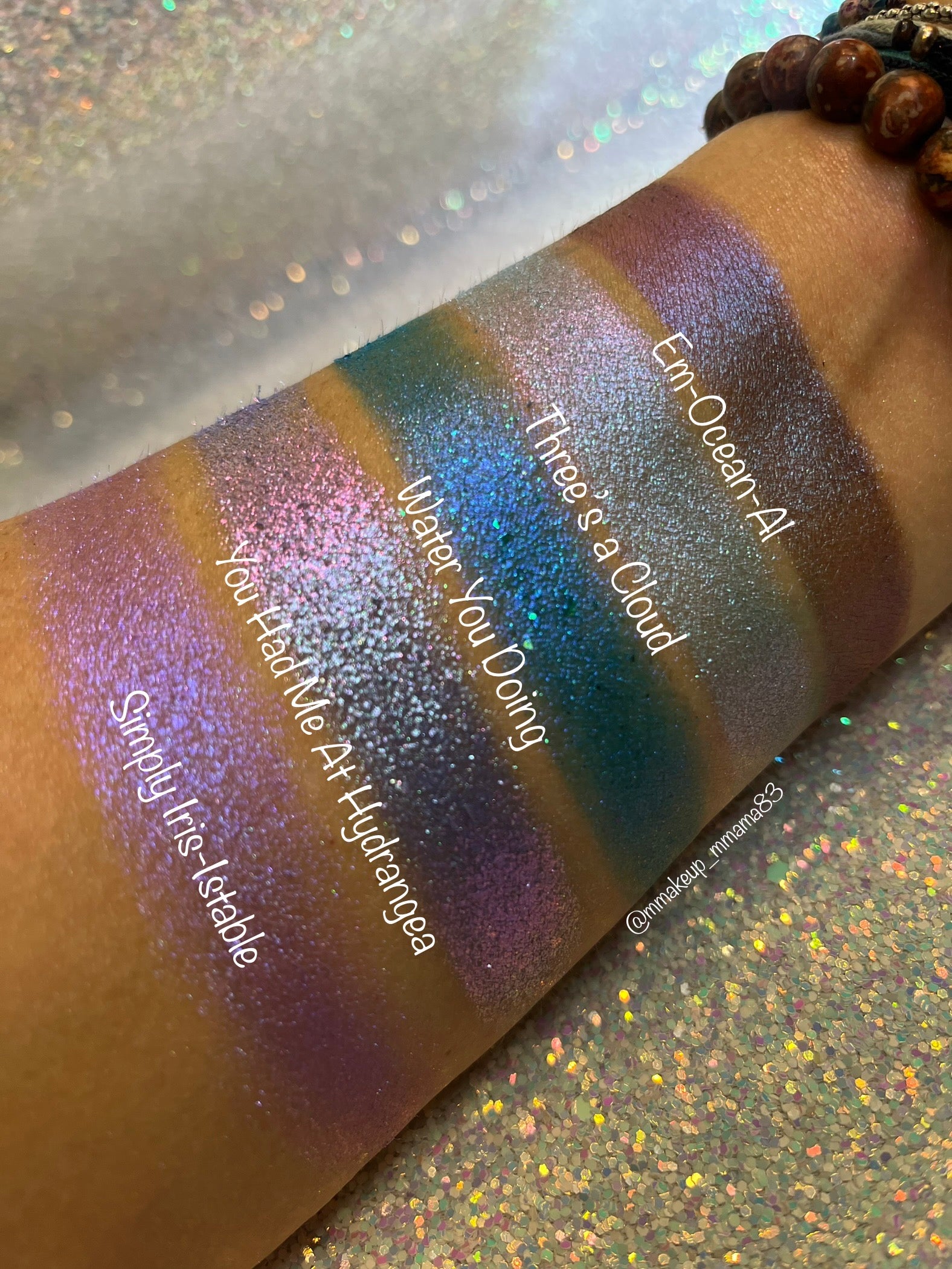 A soft, creamy, flaky - Iridescent cobalt blue to purple to periwinkle to grey multichrome, with teal to purple to pink to orange multichrome flakes. (Use as a topper, or over a black or white base to make the iridescent beauty pop).
