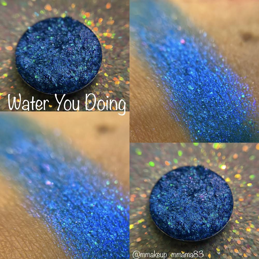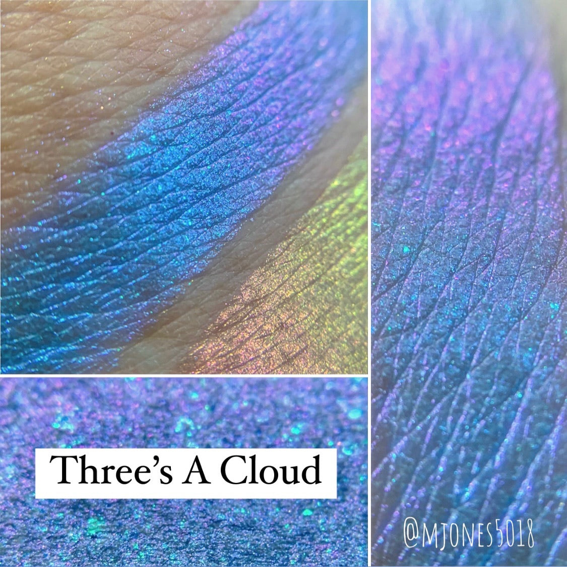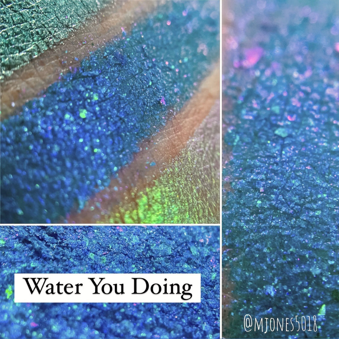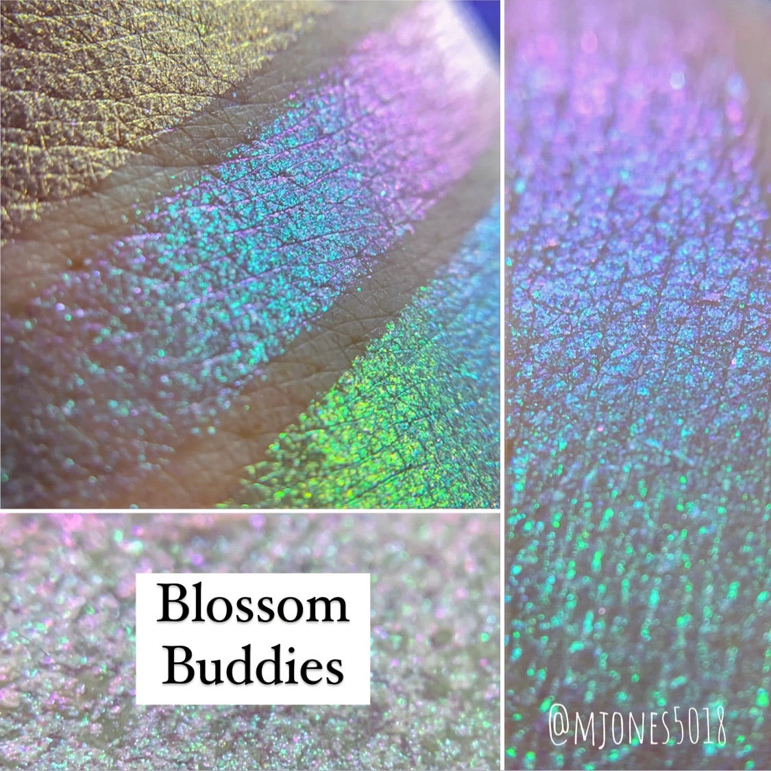 A soft, creamy, flaky - Iridescent cobalt blue to purple to periwinkle to grey multichrome, with teal to purple to pink to orange multichrome flakes. (Use as a topper, or over a black or white base to make the iridescent beauty pop).
